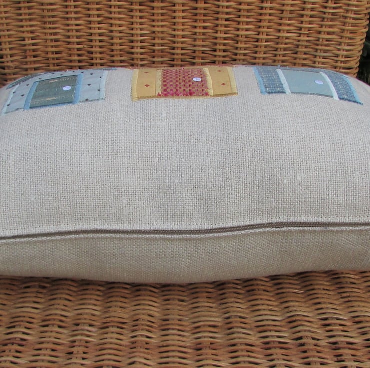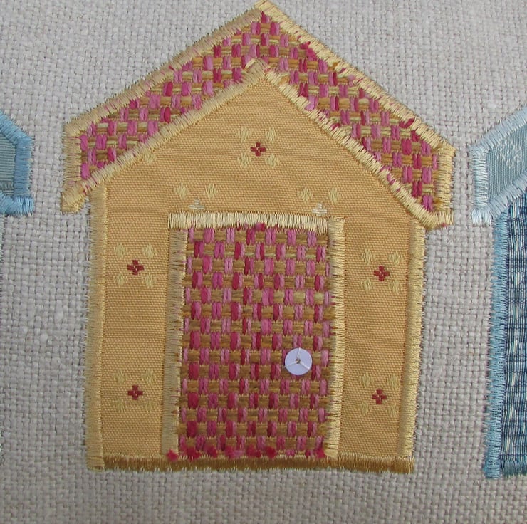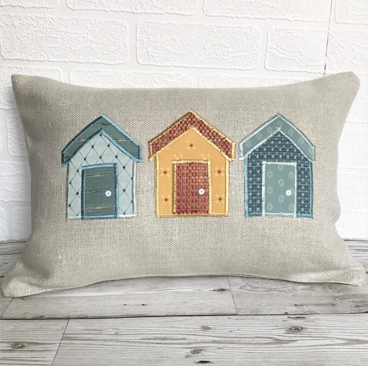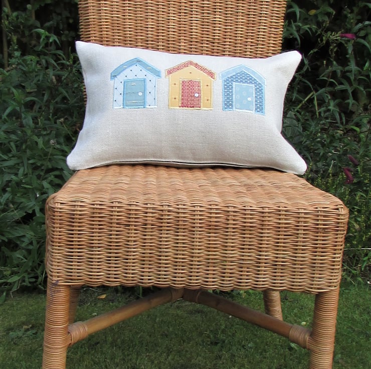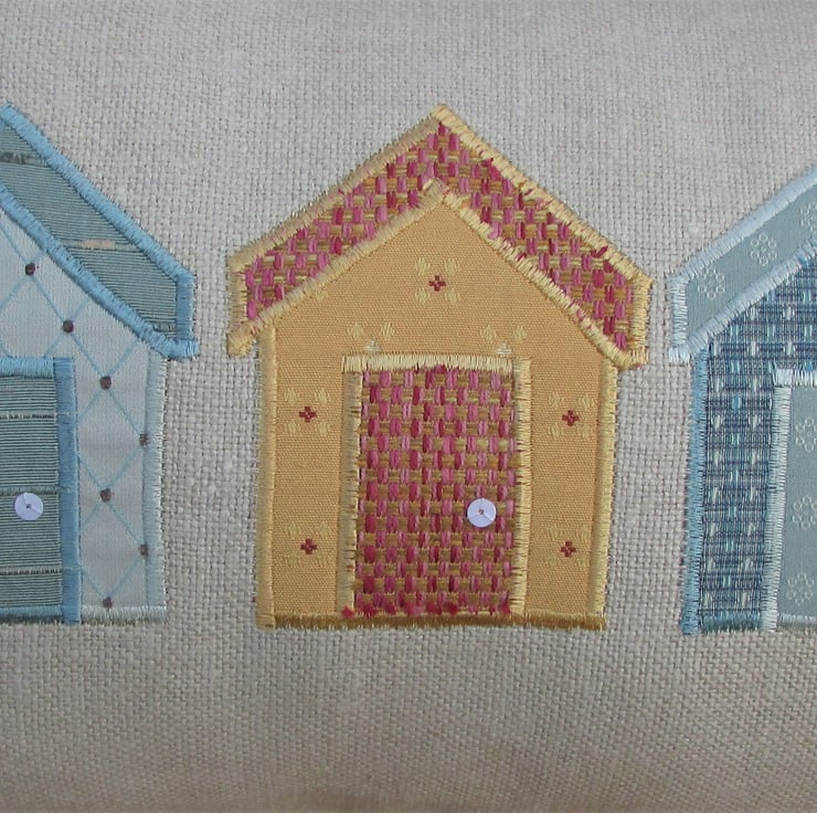 A rectangular beach huts cushion in cream with three applique beach huts. The huts all consist of fabrics with woven patterns. There is a golden-yellow hut with little red crosses and a salmon pink and gold door and roof, a blue patterned hut with a duck egg blue door and roof, and a duck-egg blue hut with a woven trellis and brown dot pattern and a blue-green door and roof. The doors have been embellished with white sequin door handles.