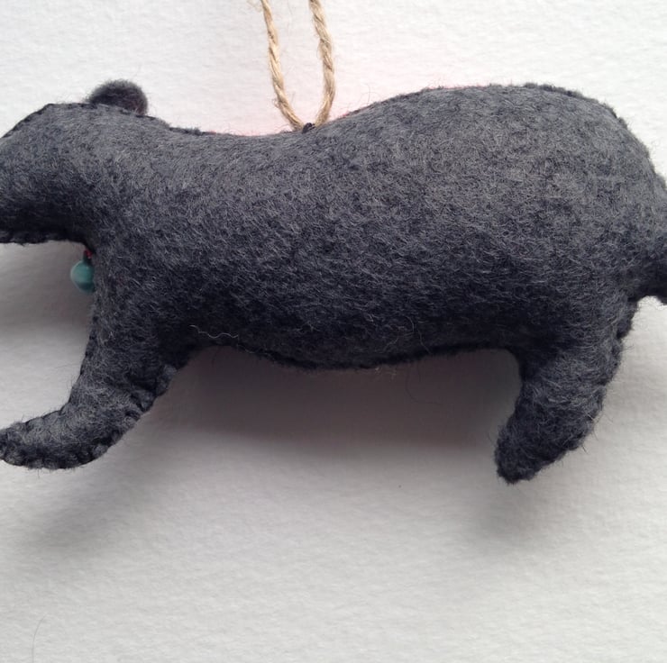I have designed and hand sewn this little badger, he is made of felt and is filled with toy stuffing. He measures approximately 14 cm long and is 8cm high. He is 3cm thick and is decorated on one side only. His red coat features an embroidered snowflake.A small bell hangs on his collar and there is a loop to hang him up with.