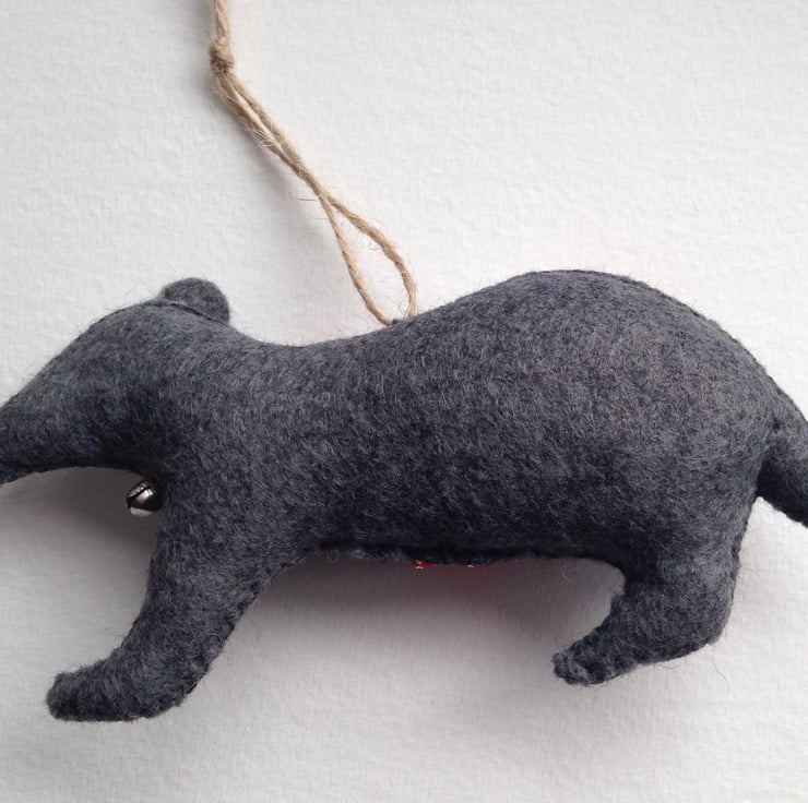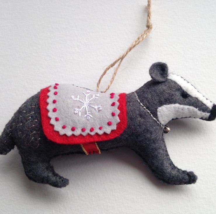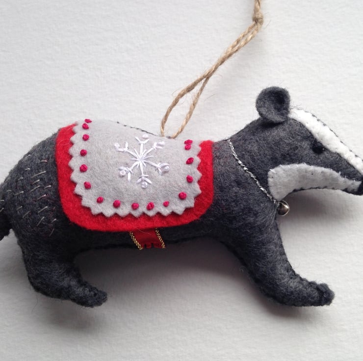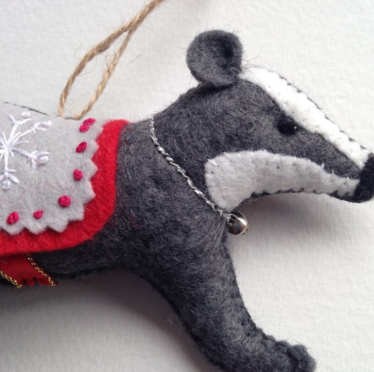 I have designed and hand sewn this little badger, he is made of felt and is filled with toy stuffing. He measures approximately 14 cm long and is 8cm high. He is 3cm thick and is decorated on one side only. His grey coat features an embroidered snowflake. A small bell hangs on his collar and there is a loop to hang him up with.