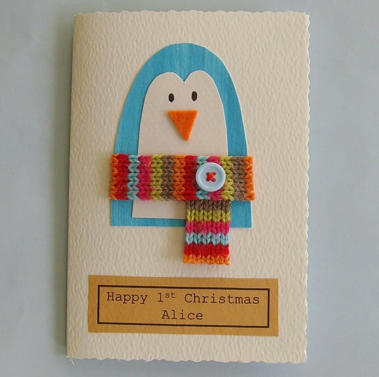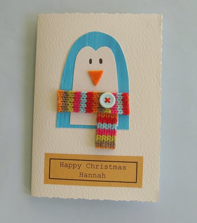 This jolly christmas card has been hand cut from painted paper and textured paper. The penguin has a felt nose, hand drawn eyes and a scarf made from recycling a stripey jumper. The card is finished off with a hand sewn button .