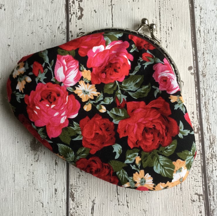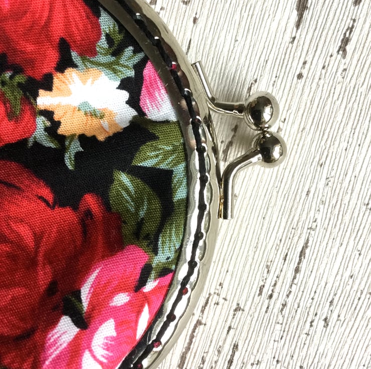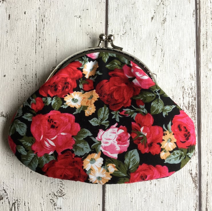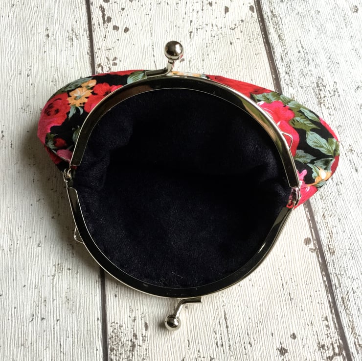 This busy dark floral pattern is bang on trend this autumn and the black background gives the dark roses a fresh rather than twee feel. The plain silver frame is attached to the purse with black embroidery thread and the black mock suede lining has my initial and year of creation embroidered within it to show this is a Made in the Temple original. Fleece interfacing gives structure and softness and will protect whatever you keep within the purse.