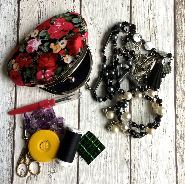 Think outside the box for this deceptively versatile little purse. It would be perfect for holding small change and a card but this four and a quarter inch clasp gives a roomy interior. Perfect for carrying small items when travelling but not taking up much room in your luggage. See the picture that shows a whole sewing set OR a 44 inch necklace, bracelet and earrings which fit effortlessly into this purse with room to spare. What will you use yours for?