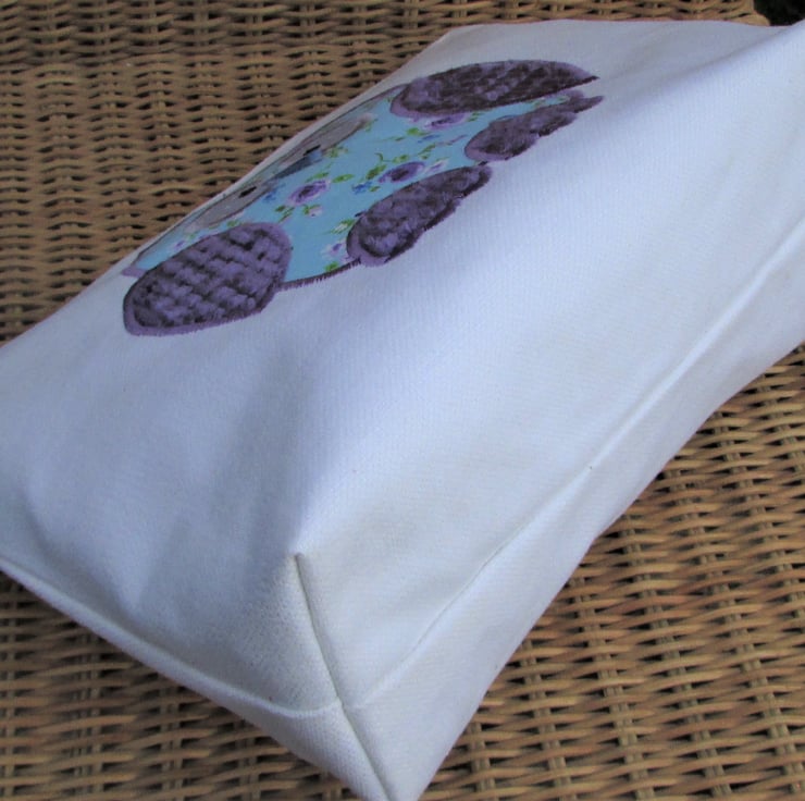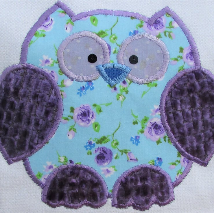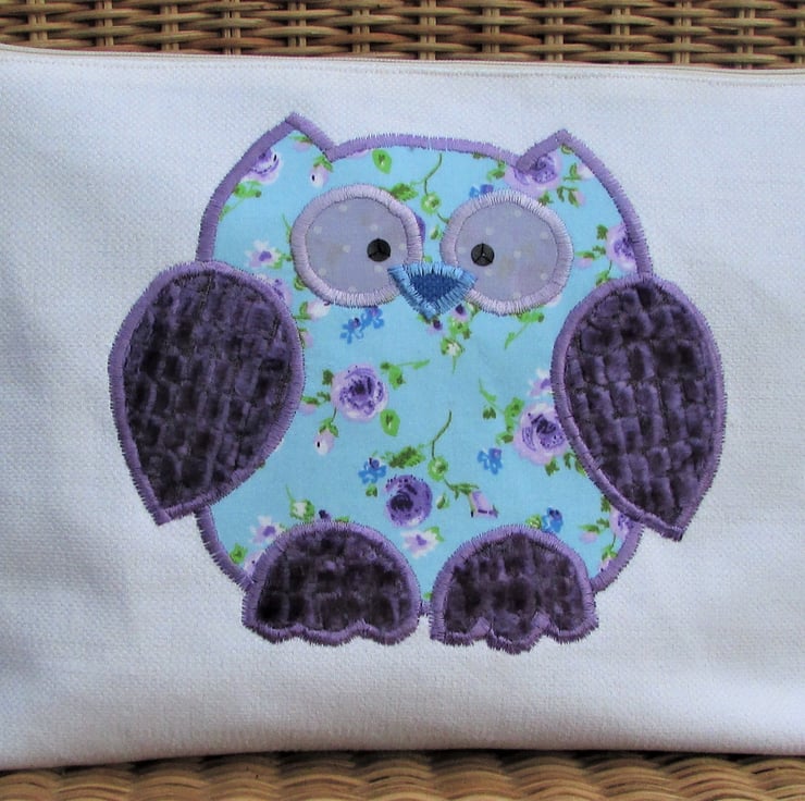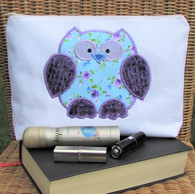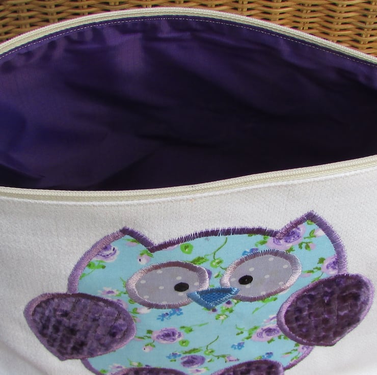 A pretty owl toiletry bag in ivory fabric with a cute applique owl. The main body of the owl is made from a floral print fabric with purple Roses on a pale blue background. The wings and feet are a luxurious purple textured velvet with a raised pattern of little squares. The owl has a blue beak and eyes made from lilac fabric with white polka dots and embellished with black sequins. The bag has a cream zip and is fully lined with purple water-resistant fabric. The base of the bag is boxed to give lots of space for all those essential items.
