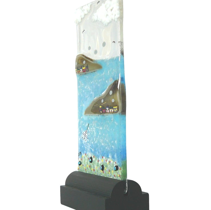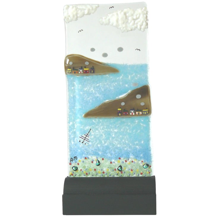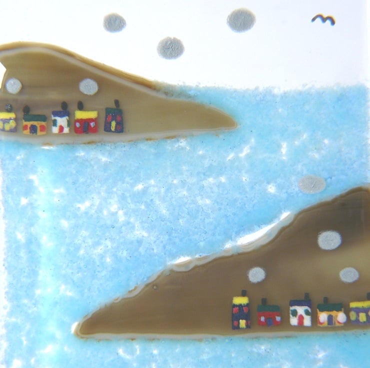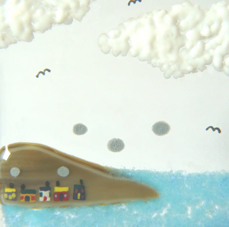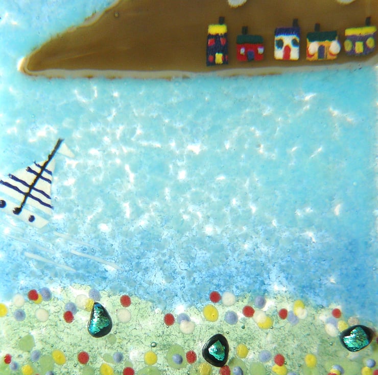 'LITTLE BOATS' started off being a transparent sheet of bullseye glass. I then built upon it putting on the different coloured layers, glass frit, dichroic glass, glass paint and coloured glass sheet. Once the image is carefully tidied up, the glass picture is fused in a kiln. The firing of the picture takes up to 24 hours as the kiln must be cooled very gradually to avoid breaking the fusing glass.