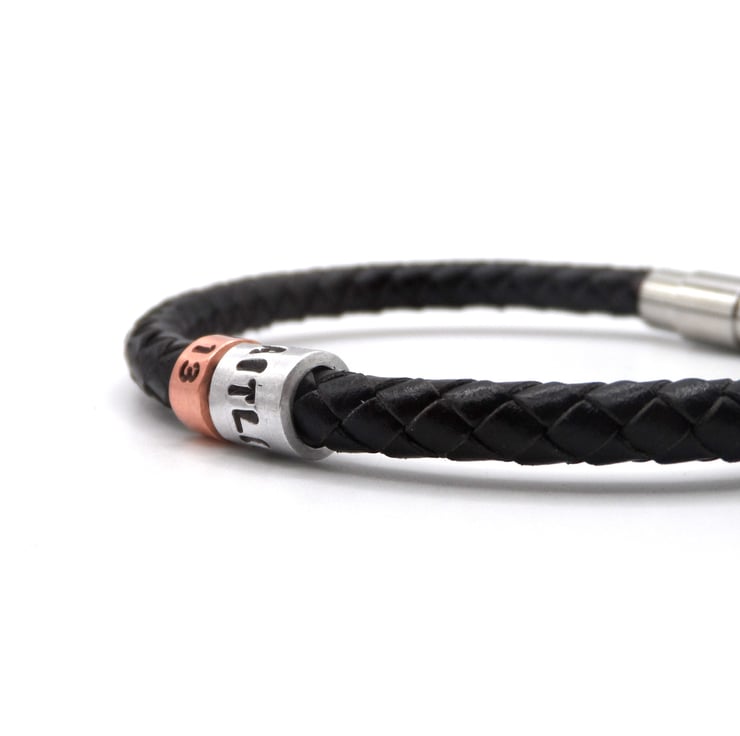 The personalised 13th Birthday leather bracelet is made with genuine braided leather that is 6 mm in diameter and has a locking stainless steel connector that ensures that it will not come undone.