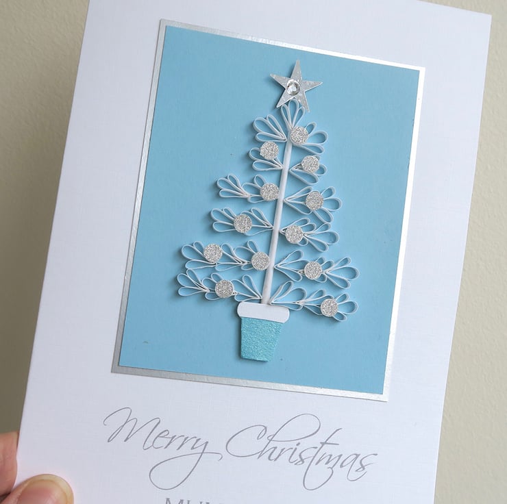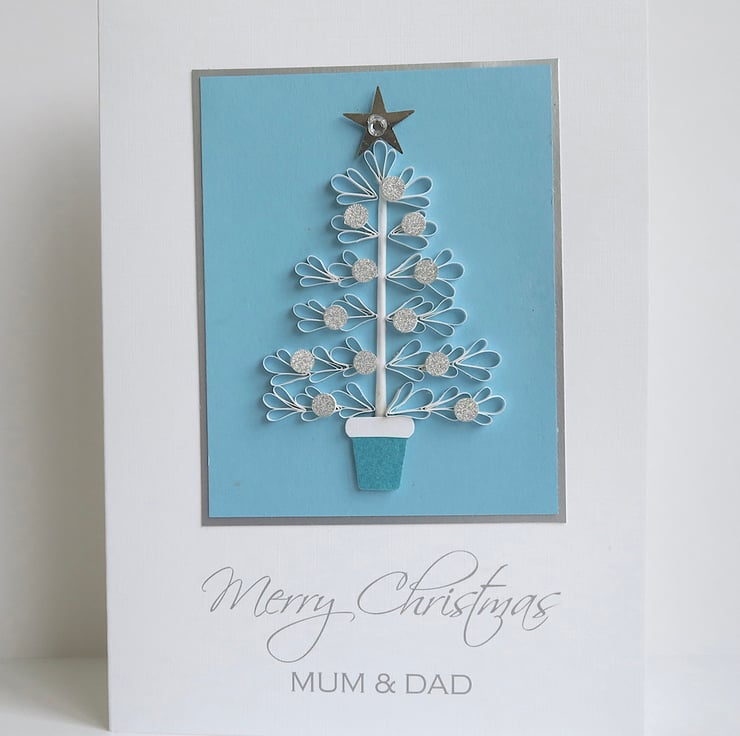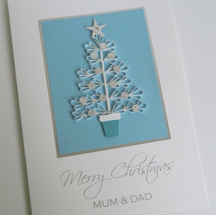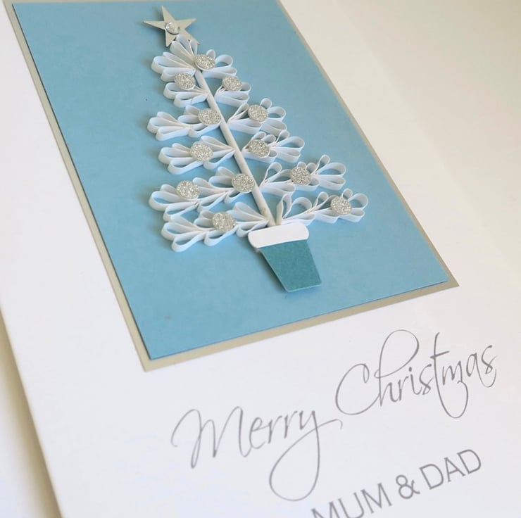 A paper quilling tree in icy colours of white, pale blue and silver. Perfect for sending special Christmas wishes to someone you love, with the added bonus of adding a personalized message - the greeting on this card reads "Merry Christmas Mum and Dad" but you can choose any message you would like.