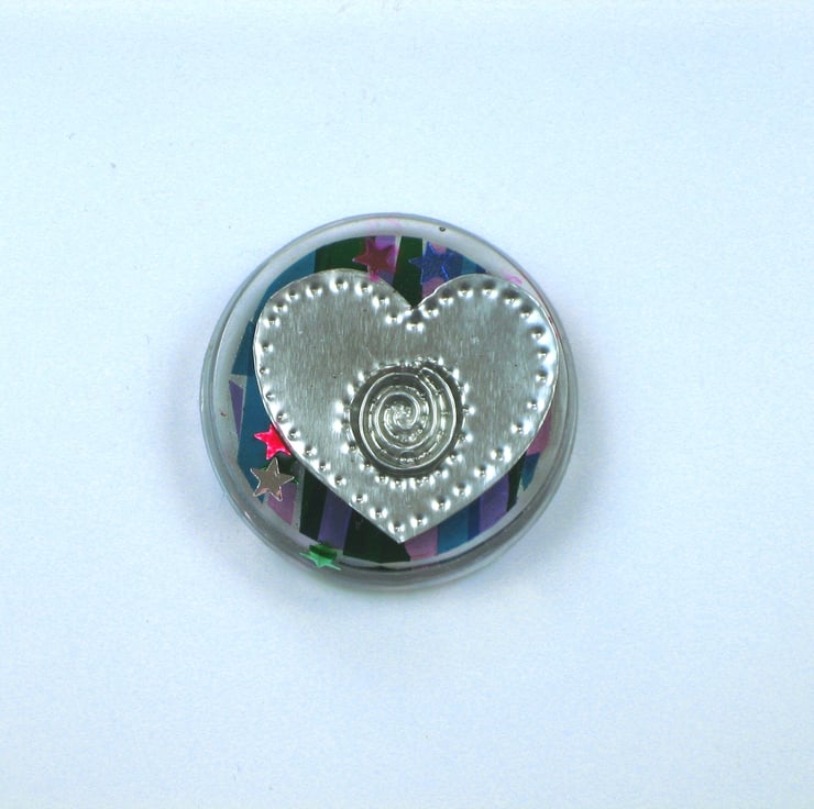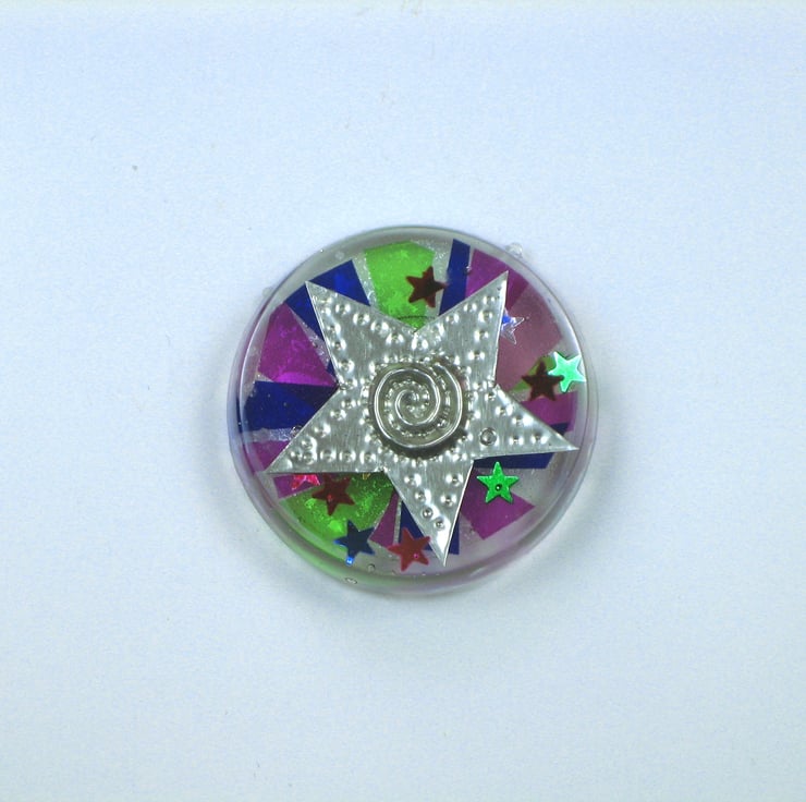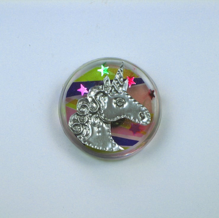 Was £10, now £7.99. Set of three handmade fridge magnets with a unicorn, a heart and a star embossed in pewter and cast in resin. Coloured with cellophane and sparkly stars.