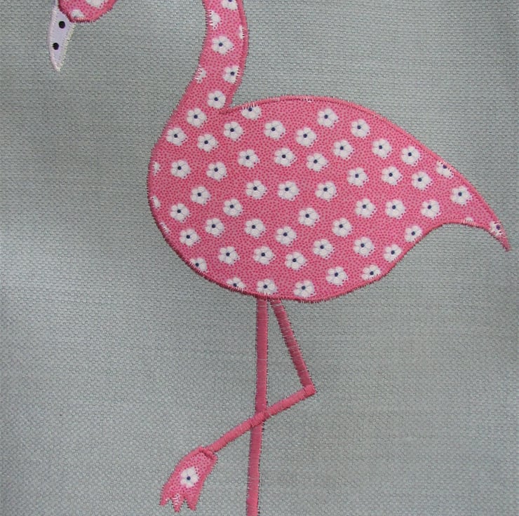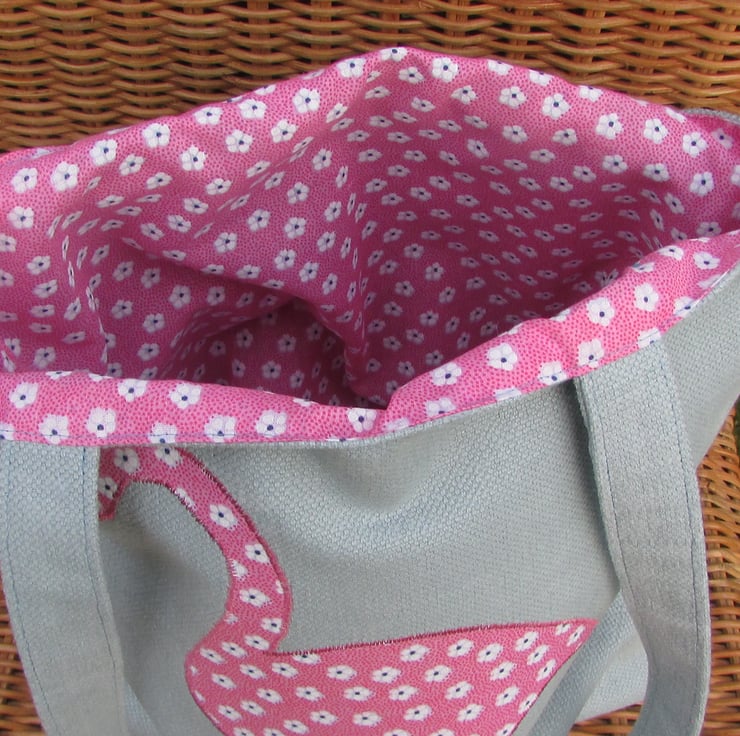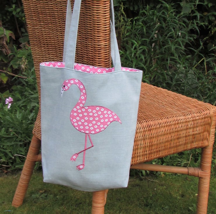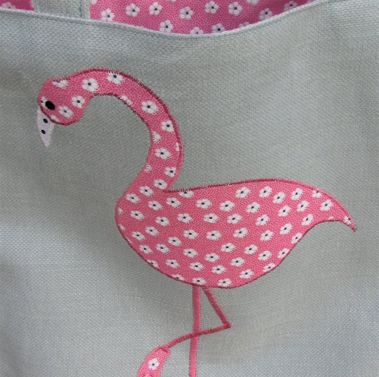 A pale blue tote bag with an applique flamingo. The flamingo is made from pink fabric with a ditsy floral pattern of white flowers. The beak is white with black polka dots. The flamingo has a black sequin eye. The bag is lined with pink floral fabric which matches the flamingo.