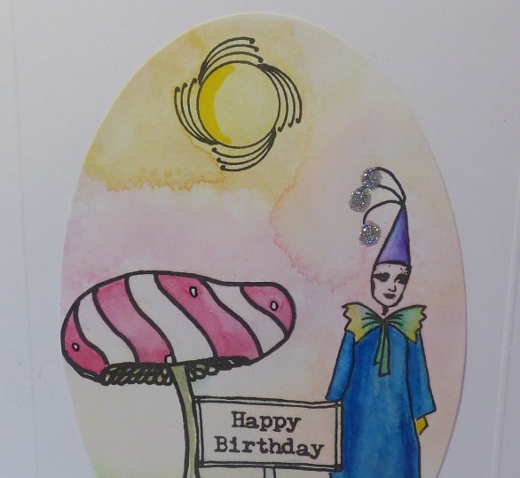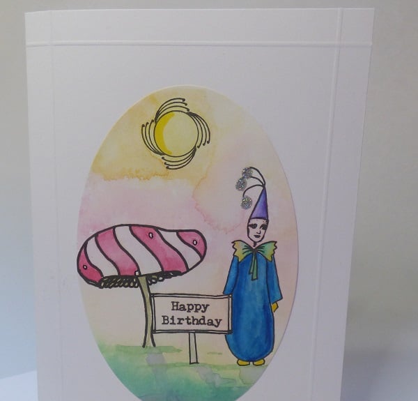 I have created a world on the woodland floor, featuring a little clown named Willow in a colourful baggy outfit and glittery hat, she stands under the warm glow of the sun, next to a stripey toadstool. She has a sign featuring a Happy Birthday sentiment.