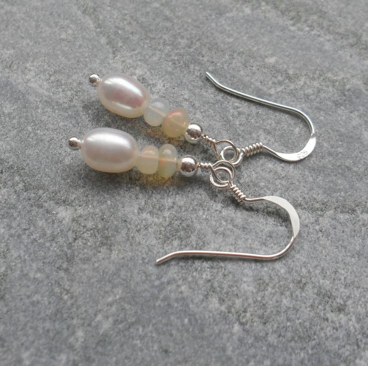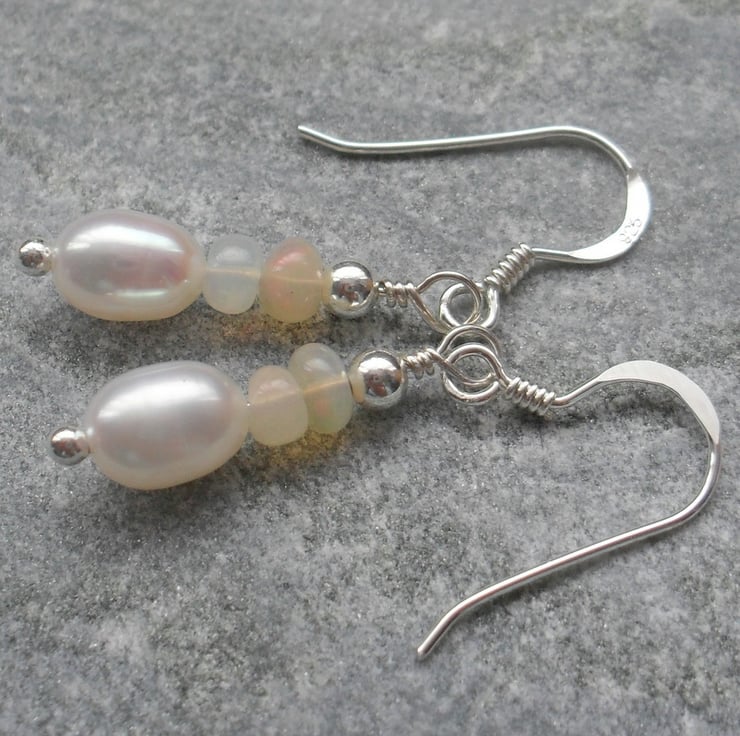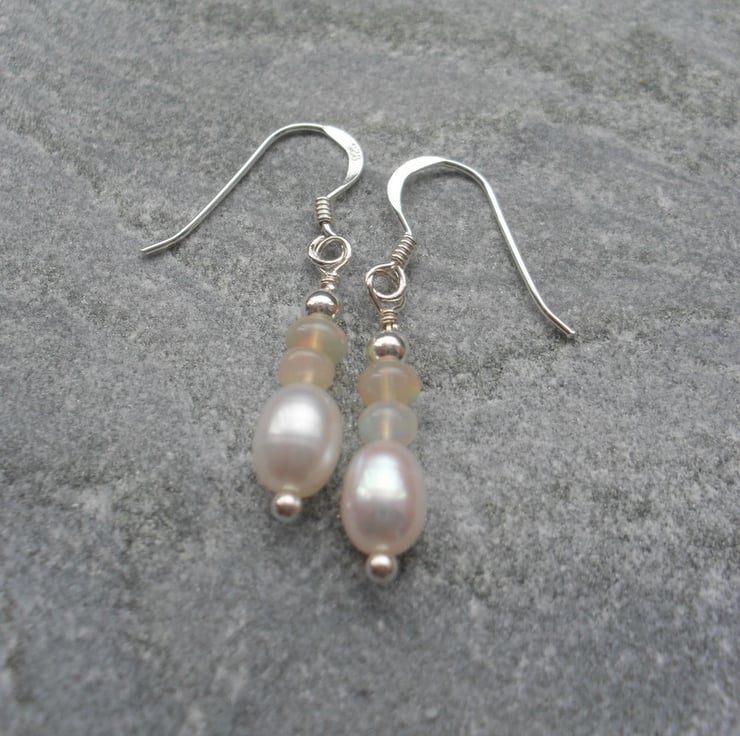 Sterling silver earrings with genuine Ethiopian opals which have colours of red and green as they move in the light and freshwater pearls