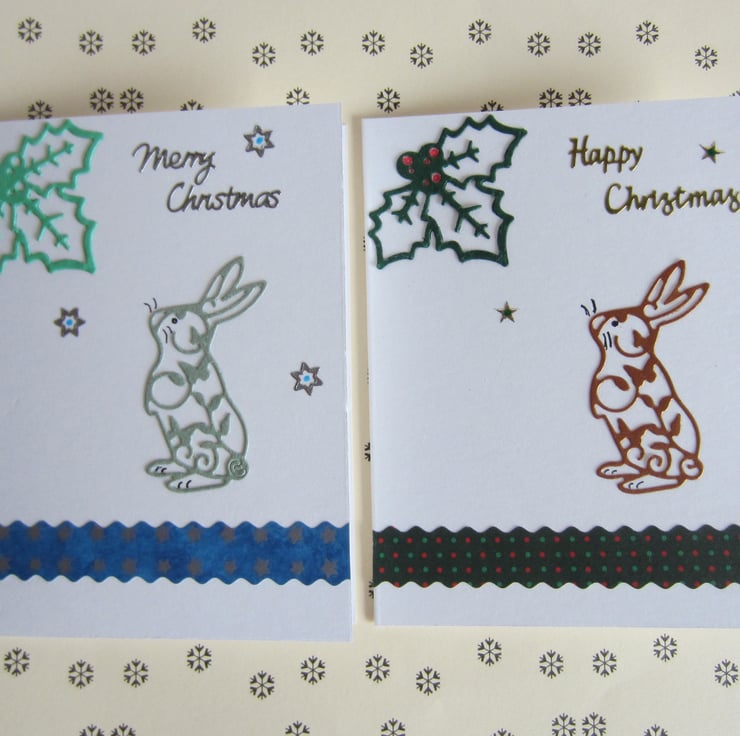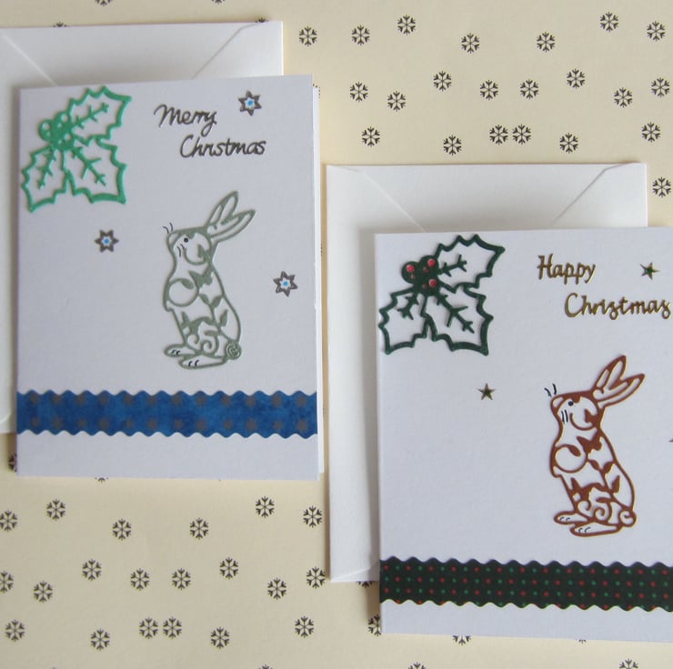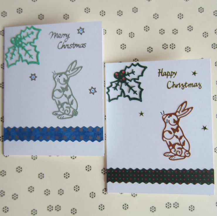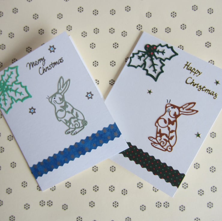 2 small handmade Christmas cards, decorated with bunny rabbit and holly die cuts.