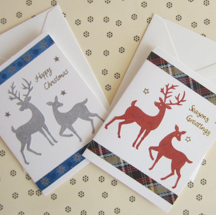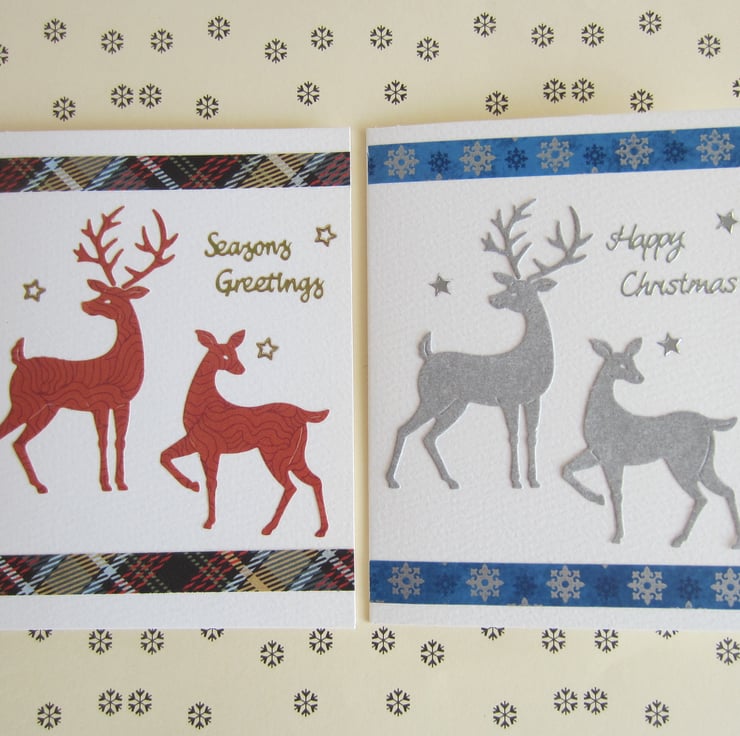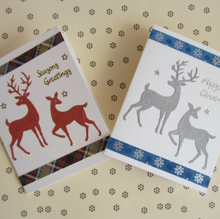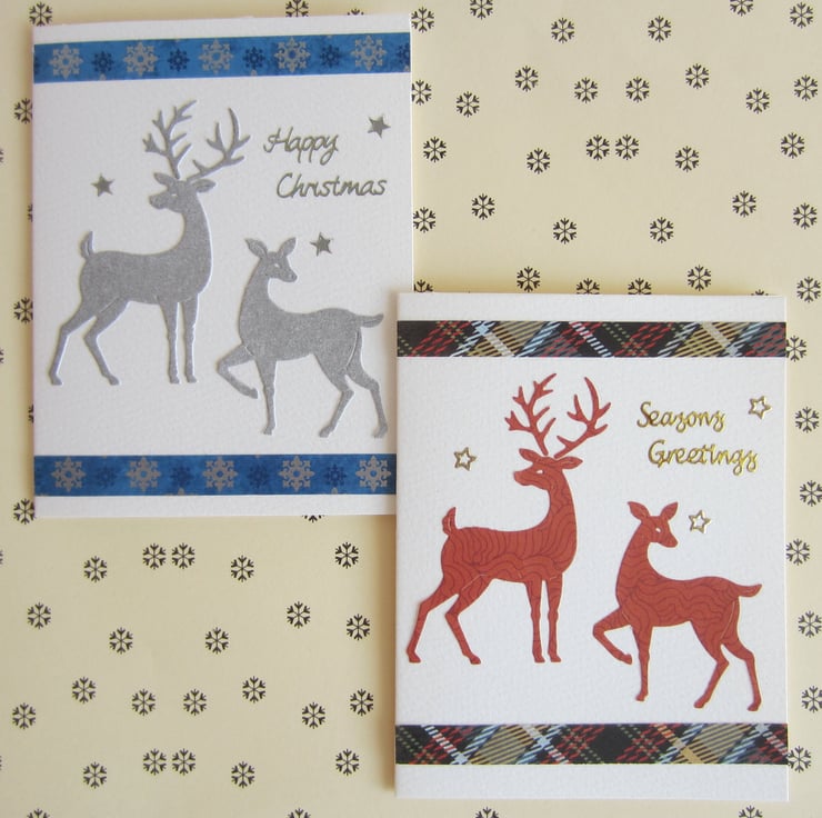 2 handmade Christmas cards, decorated with stag and deer die cuts.