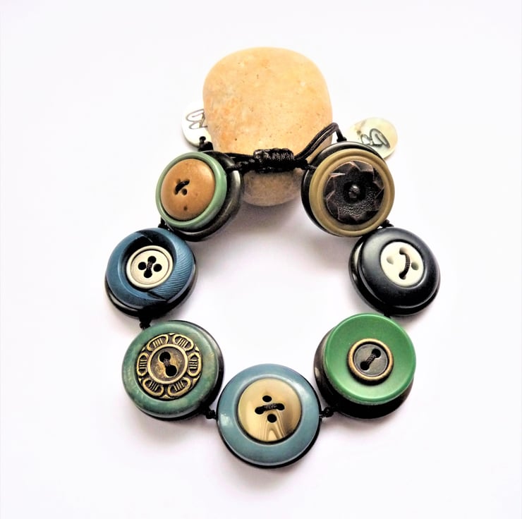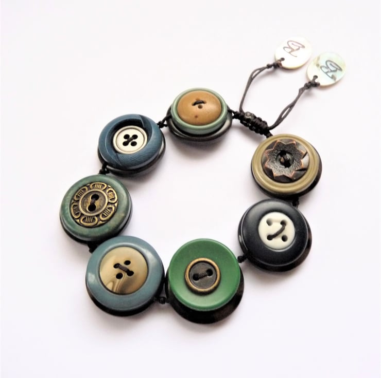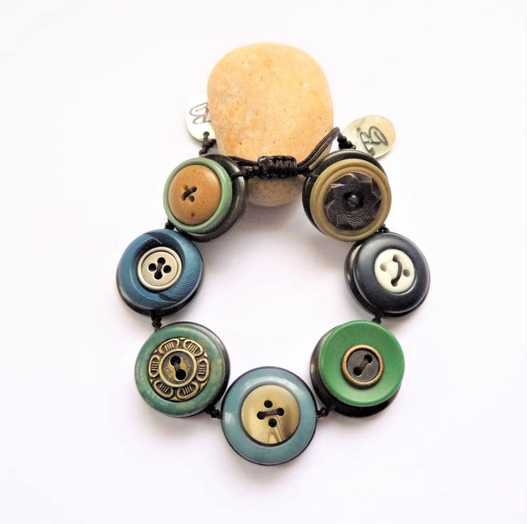 A gorgeous lot of vintage buttons formed this stunning piece of bracelet. Also this bracelet was designed from my vintage buttons collection so you will be the one to own this charming piece of jewelry. Two of my signature B laser onto tiny shell pendant to finish the look.