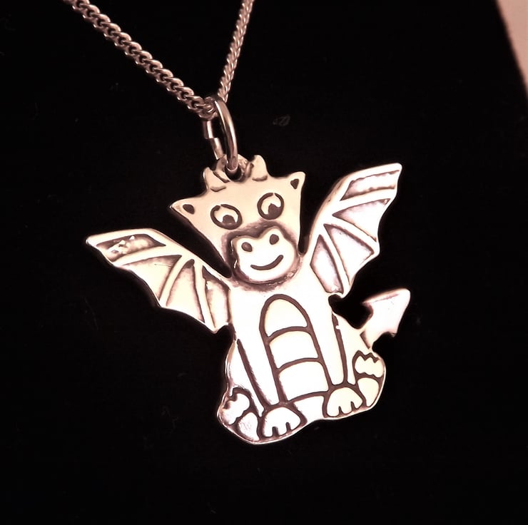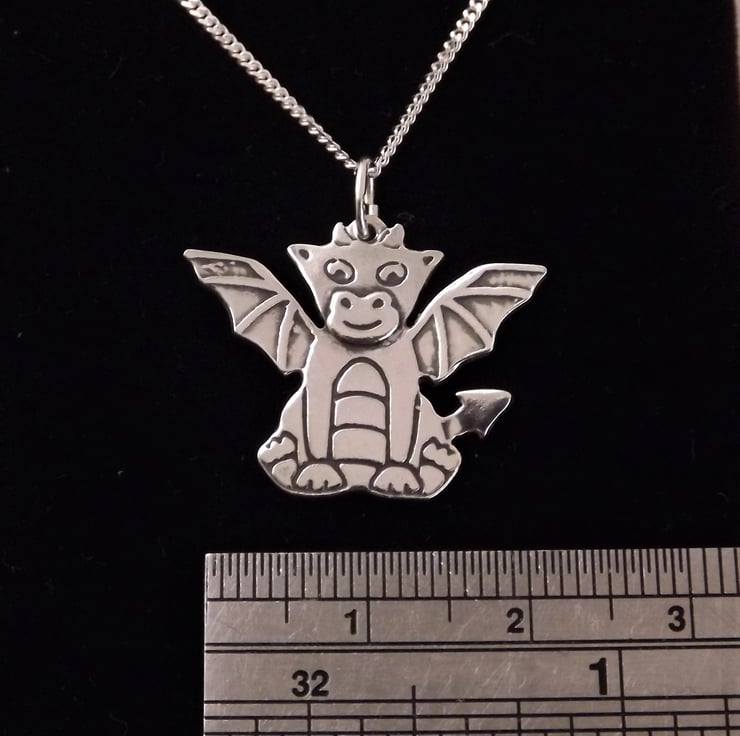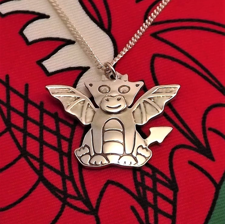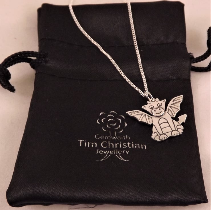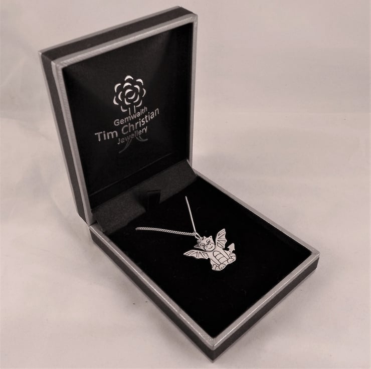 This sterling silver dragon pendant measures 23mm wide and 19mm high and comes on an 16, 18 or 20 inch sterling silver curb chain. It is sent in either a branded pouch or gift box.