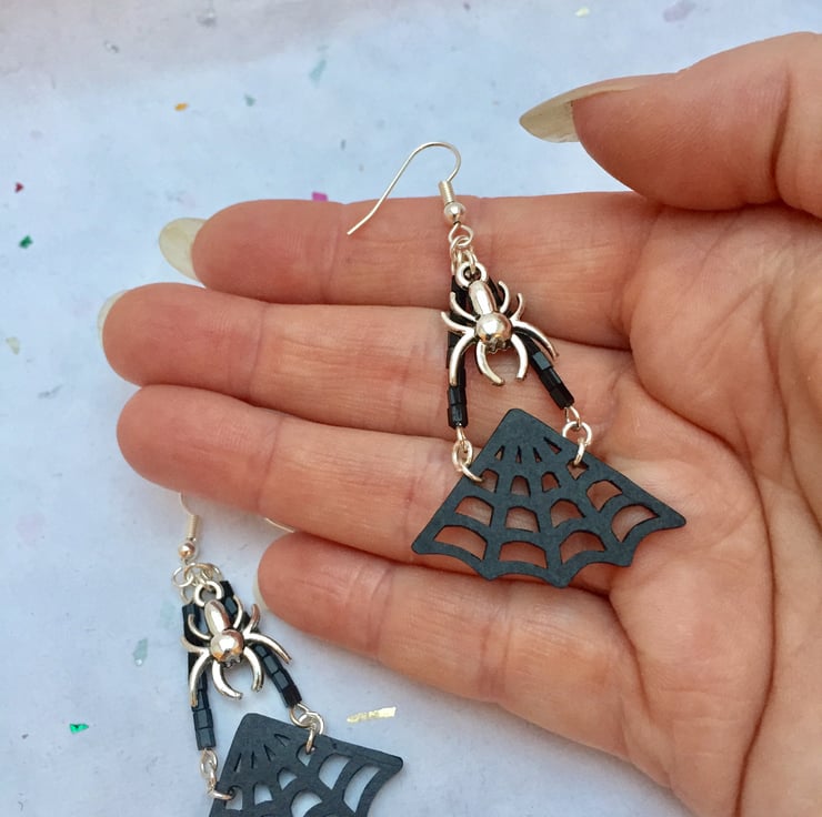 These spooky earrings feature black shrink plastic cobwebs being suspended from black sparkling hex shaped seed beads and a silver plated spider charm.