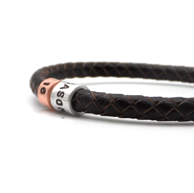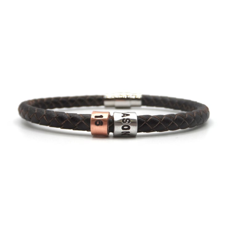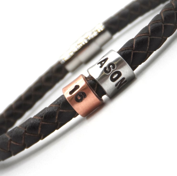 The personalised 16th Birthday leather bracelet is made with genuine braided leather that is 6 mm in diameter and has a locking stainless steel connector that ensures that it will not come undone.