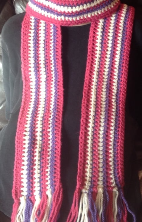 Lovely ladies crocheted scarf. Striped with tassels. Warm and cosy for those cold wintery days.