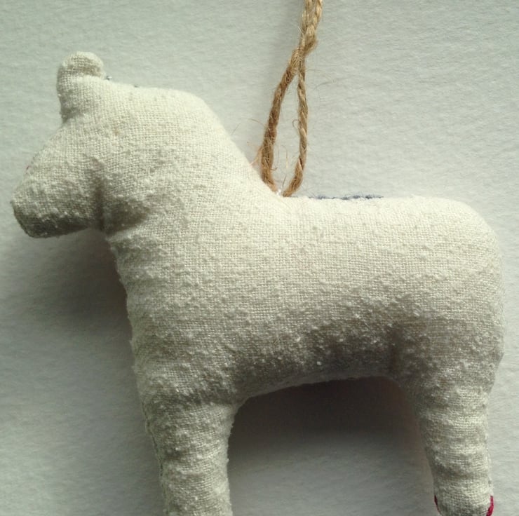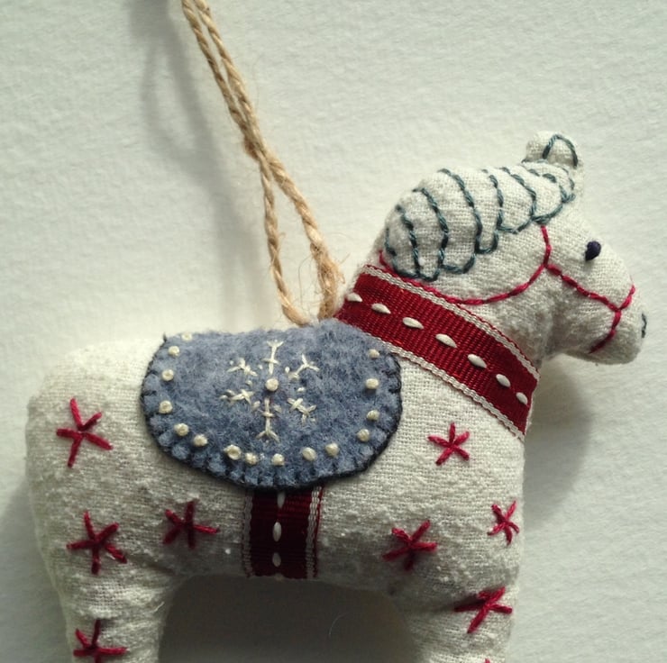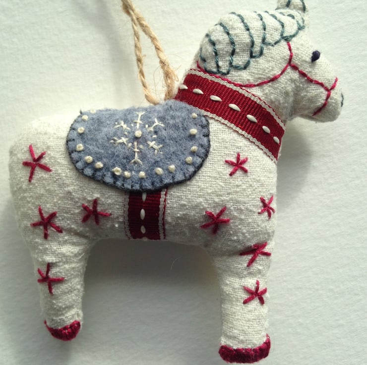 I have designed and hand sewn this Dala horse. He is decorated with embroidery, felt and ribbon on one side and is 9cm wide,10cm high and 2 cm thick. He is made from white cotton and is filled with toy stuffing. There is a string loop to hang him up with.