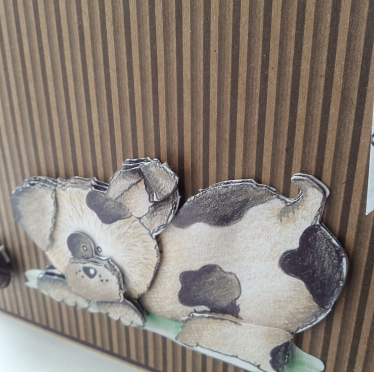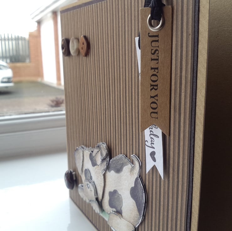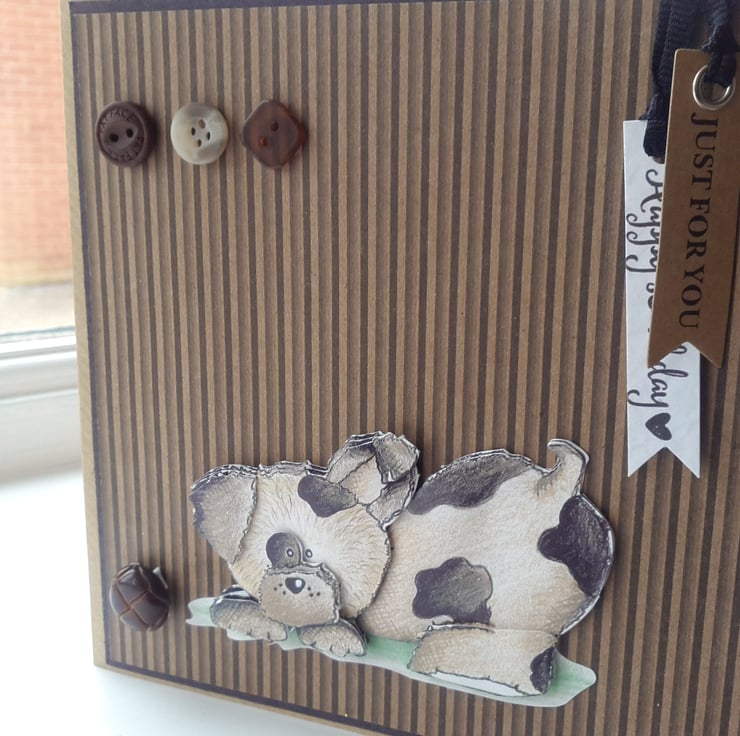 A completely handmade and uniquely designed card. Consisting of a cute doggie decoupage playing with leather football button mounted onto co- ordinating brown striped paper then onto black card and then onto quality brown paper look alike quality!it card. Finished off with happy birthday and just for you dangley tags and three co-ordinating brown buttons.