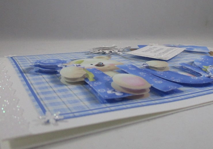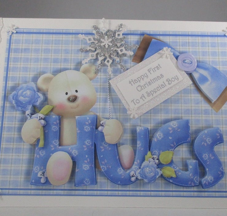 A landscape card measuring 210x148mm (8.25x6in) has a design of a 3D bear and HUGS. The bear is holding a beautiful glittery snowflake in silver and white. I have used white sparkly card for edges and white sparkly snowflakes