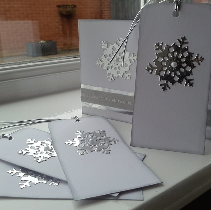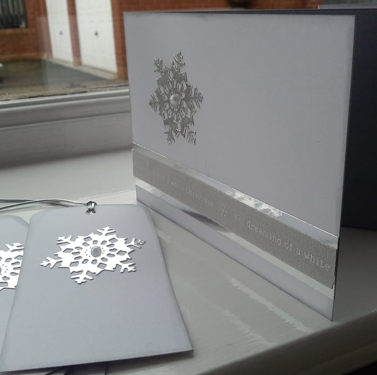 A completely handmade and uniquely designed pack of 4 cards. Consisting of a snowflake die cut from silver mirri card with pearl centre. Mounted onto quality pristine white card. Finished off with I'm dreaming of a white Christmas silver grey ribbon mounted onto silver mirri card.