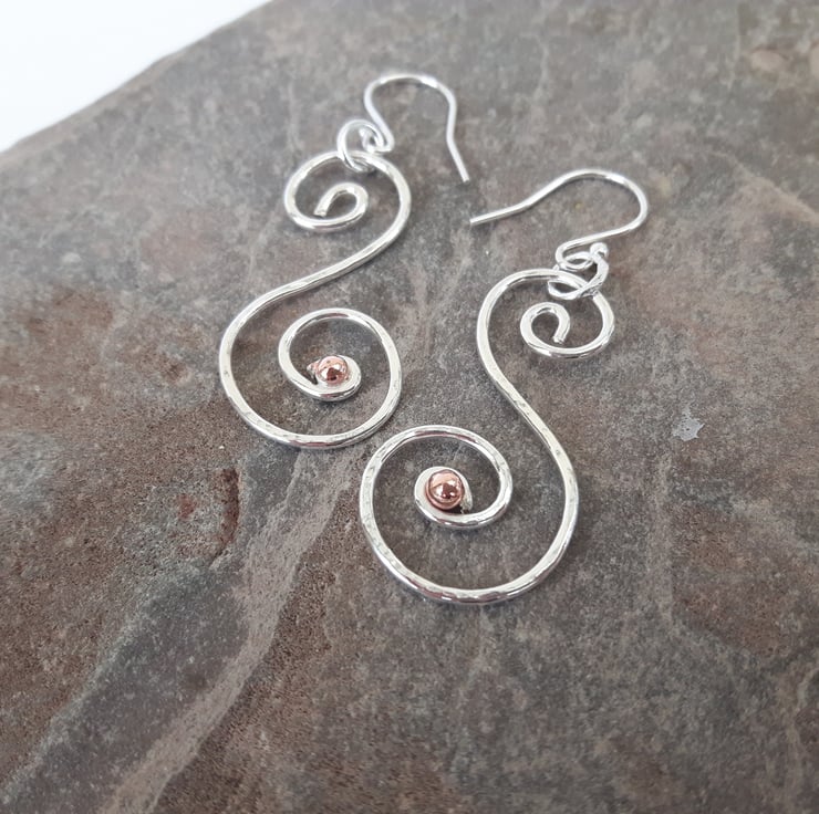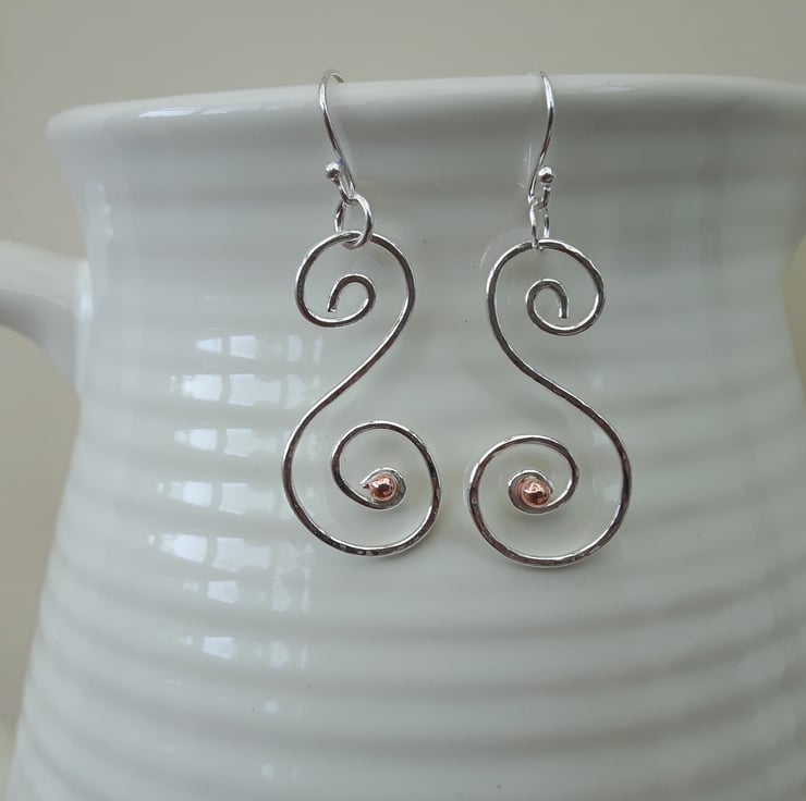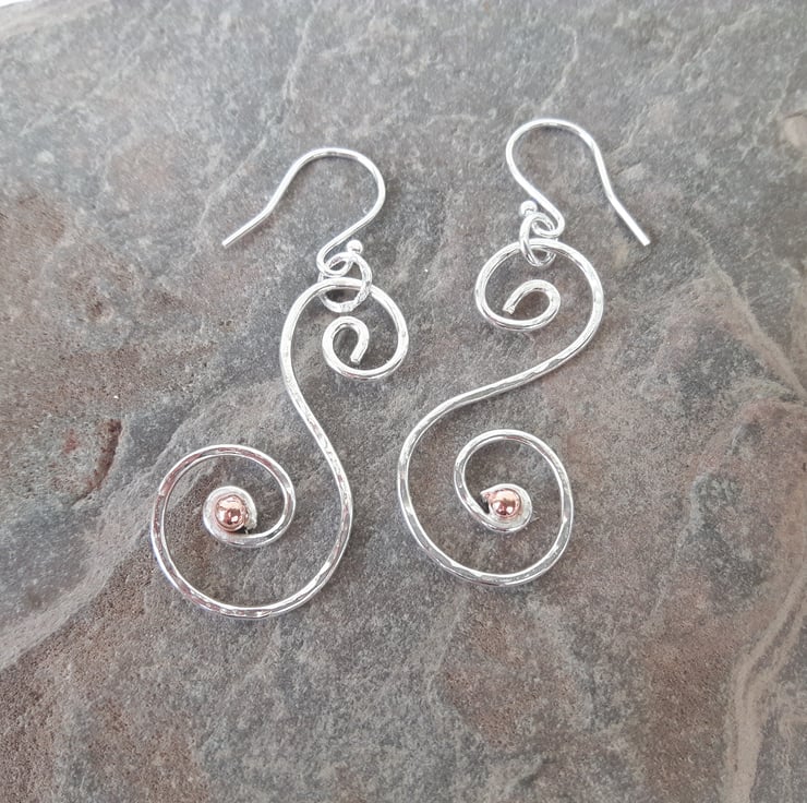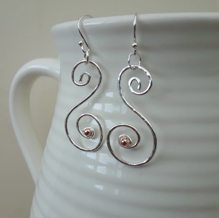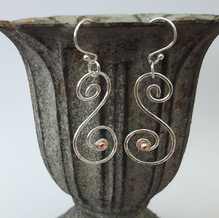 These sterling silver drop earrings have been hand made from 1.2mm wide sterling silver wire, twisted into an S-shaped double spiral and forged with a ball pein hammer to achieve a dimpled texture. For a touch of contrast I have added a copper granulation to each of the lower spirals. The scrolls are suspended by means of soldered jump rings from neat sterling silver ear hooks, stamped .925 to indicate the purity of the silver. The drop below the hook is 3.3cm/1.3inches and each earring weighs 1.8g. They are light to wear, swing freely and have been tumble polished so they sparkle in the light - an ideal gift for the party season. These earrings will be packaged in a smart gift box and sent to you by Royal Mail first class post.