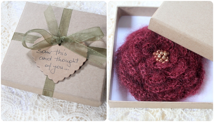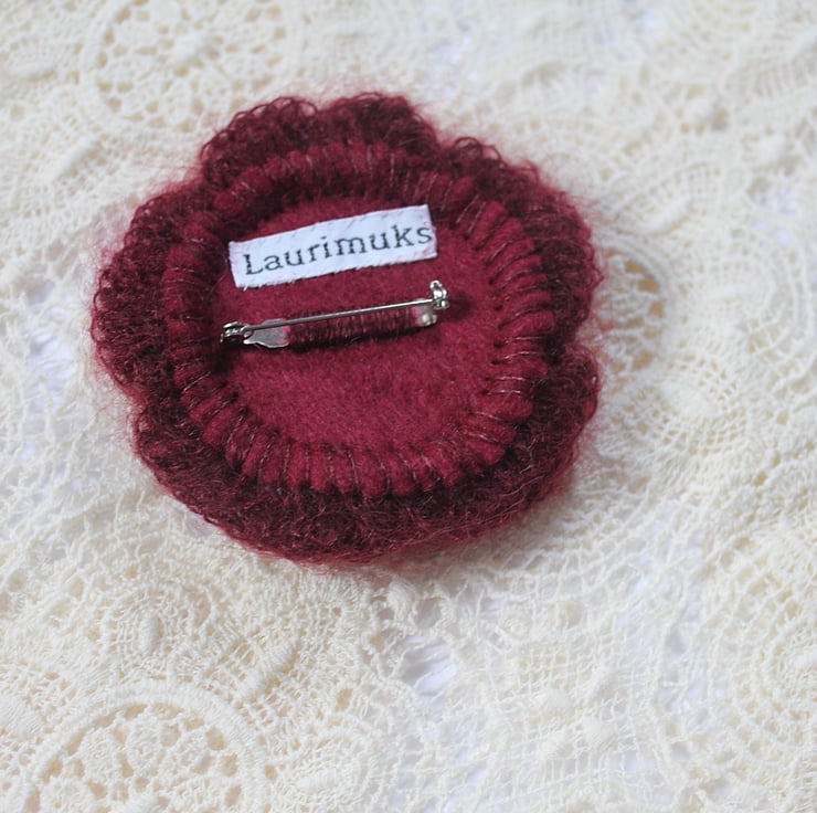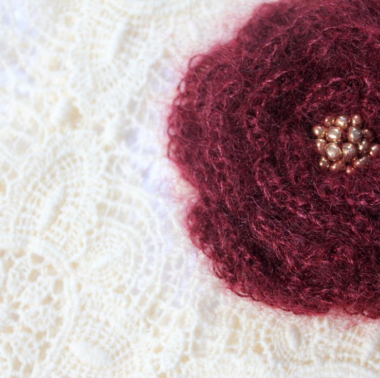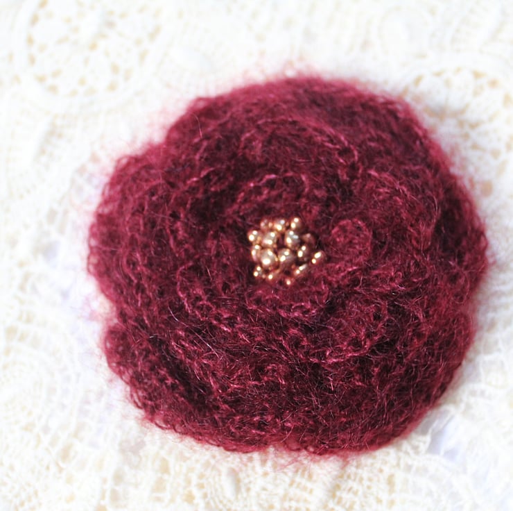This adorable flower brooch is hand crocheted out of a beautiful and versatile fine yarn made from a blend of super kid mohair and silk (70% Mohair, 30% Silk)