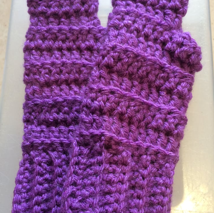 A lovely pair of children’s fingerless gloves. Lined pattern with ribbed cuffs. With a touch of sparkle.