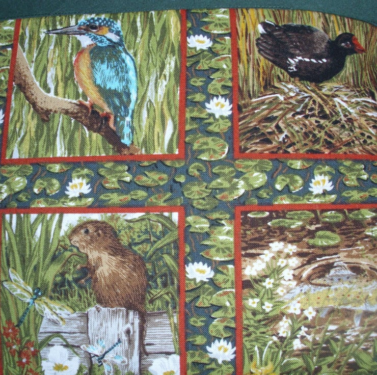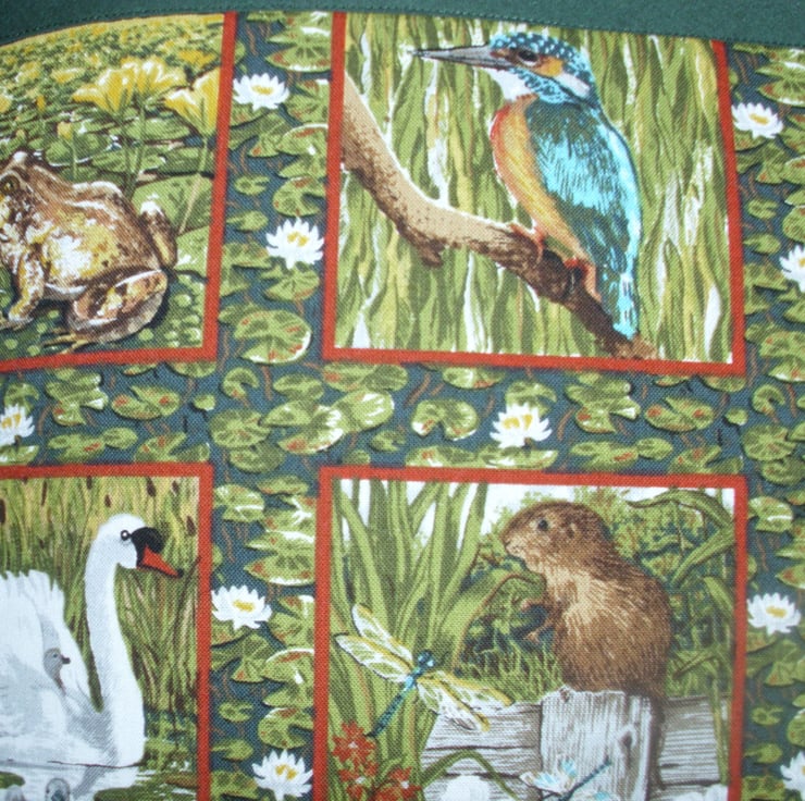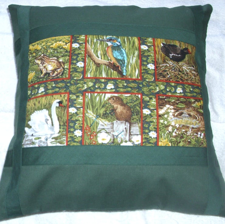 Friends of the riverbank cushion with a swan, water vole, kingfisher, moorhen, frog, fish and dragonfly with waterplants and water lilies.