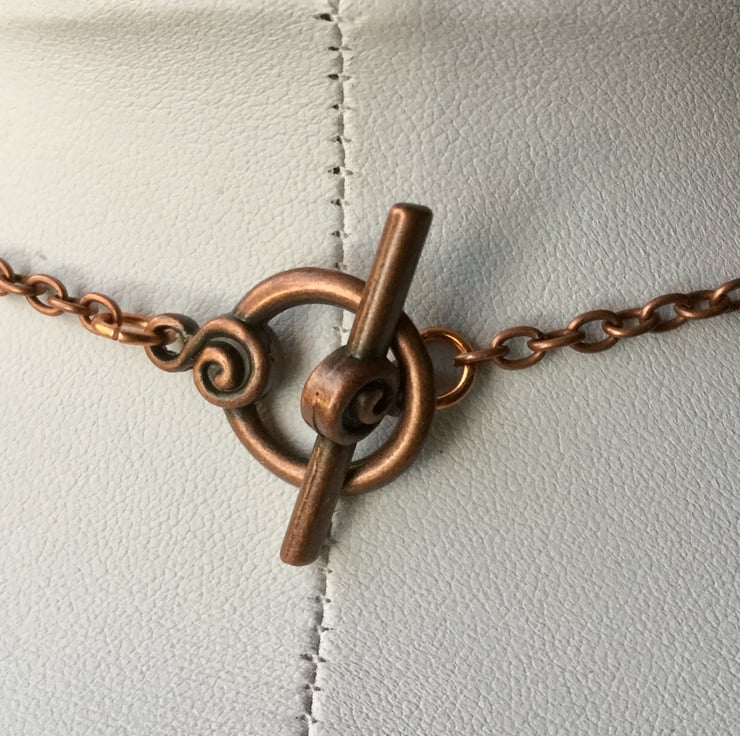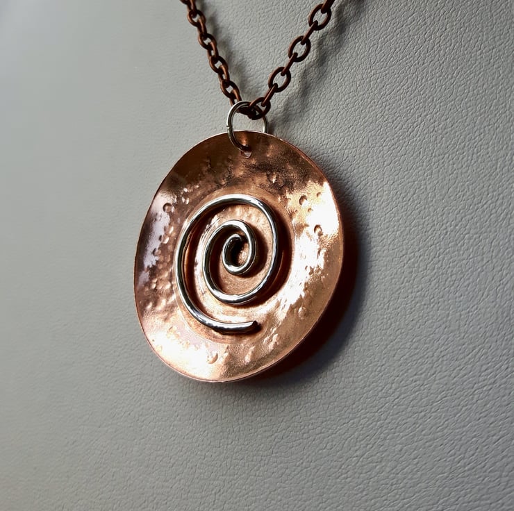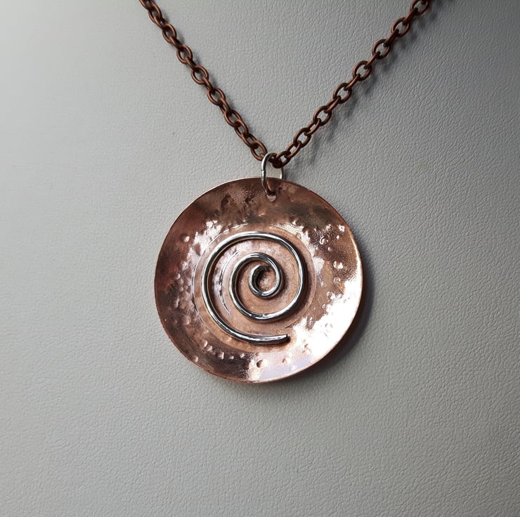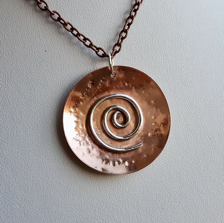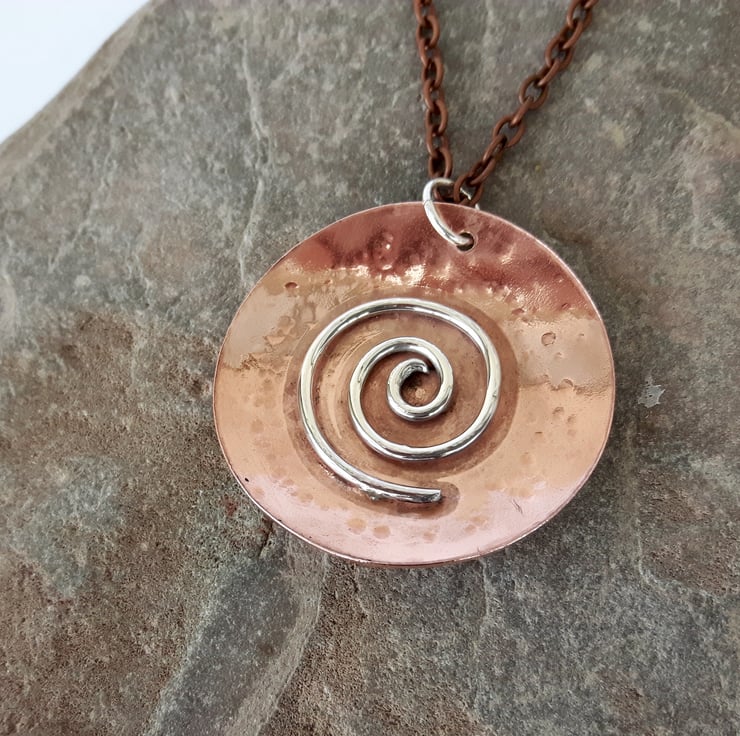 This copper and sterling silver pendant was inspired by images of spiral galaxies - a perfect gift for stargazers! The circular copper sheet has been domed and forged with a ball pein hammer to add texture, The sterling silver wire was formed into a spiral shape and hammered lightly before soldering it onto the copper. I have added a sterling silver jump ring to act as a bail and a copper toned chain with ornate Tibetan toggle and ring clasp. The pendant has been tumble polished to a bright shine and treated with Renaissance wax to preserve the finish. The copper will gradually darken to a bronze colour over time and you can either leave it like that or restore the shine with metal polish.
