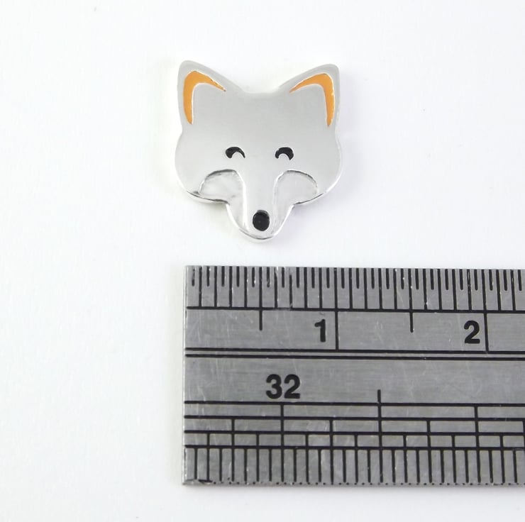 This fox badge/lapel pin/tie tack has been lovingly handcrafted in Shropshire. It is made from sterling silver sheet and is etched before being cut by hand, I then smooth the edges using files and emery paper before it's carefully given its shape using a punch and hammer. a pin is then soldered onto the back. Black and orange resin based enamels are added to the etched areas and then the piece is polished.