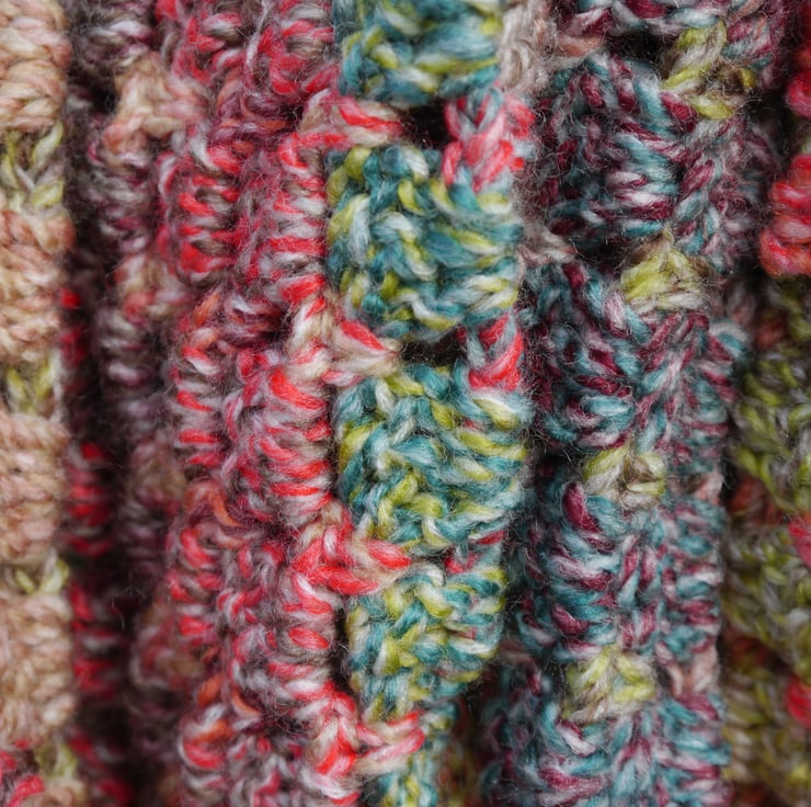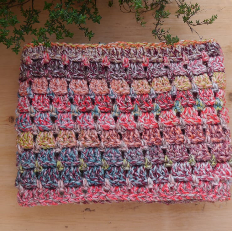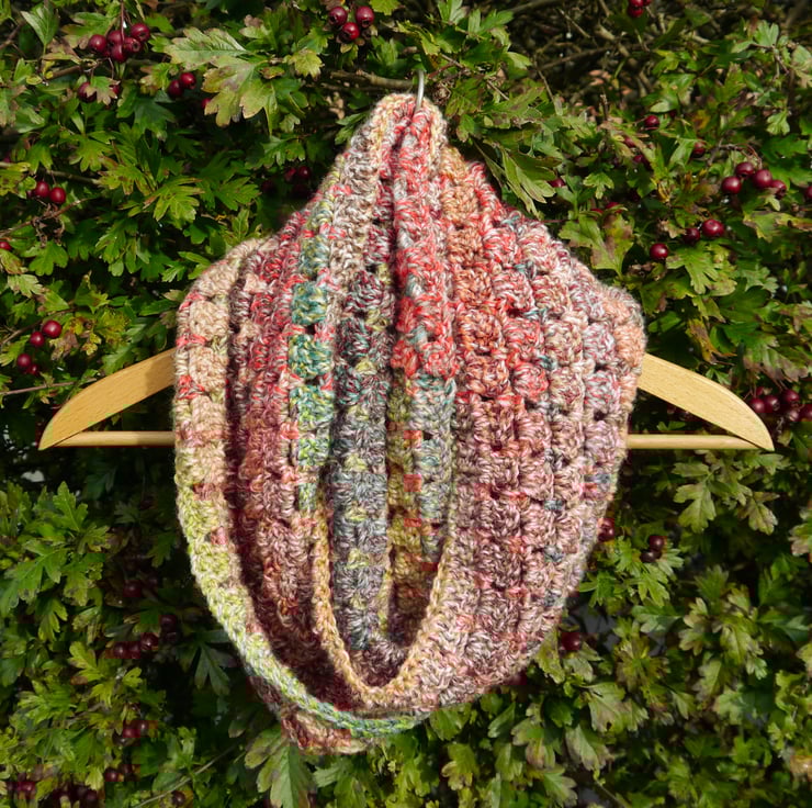 Perfect for the cold, crisp spring autumn and winter mornings . This lovely soft, warm infinity scarf is crocheted by me using James C Brett Marble chunky wool which is multicoloured. It can be worn looped either once or twice around the neck. Easy to wear with no dangling ends.