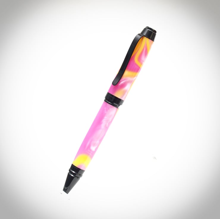 A stylish looking pen for those that prefer a bigger heavier pen. The eye catching highly iridescent barrels are made from an acrylic resin that has been carefully hand turned, sanded and polished to a glass like finish. Once I'm satisfied that the barrels are perfect the black chrome plated components are then assembled into them.