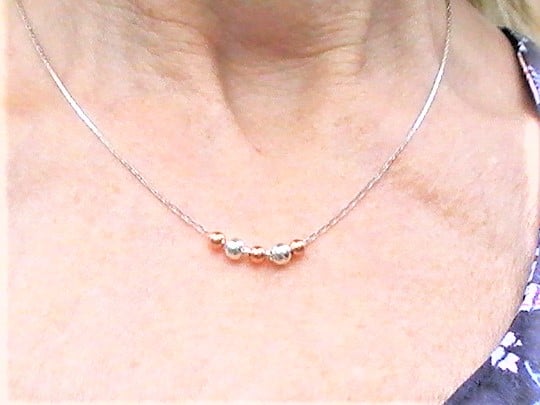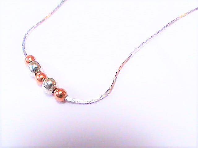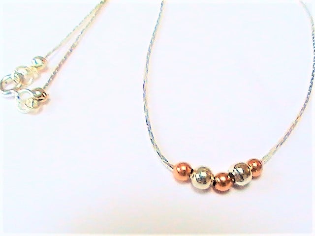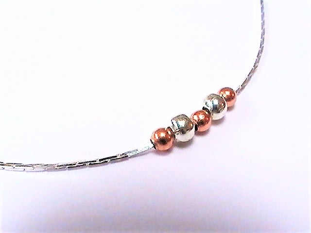 A very dainty necklace with fine silver plated chain, a minimalist design with tiny silver and copper beads.