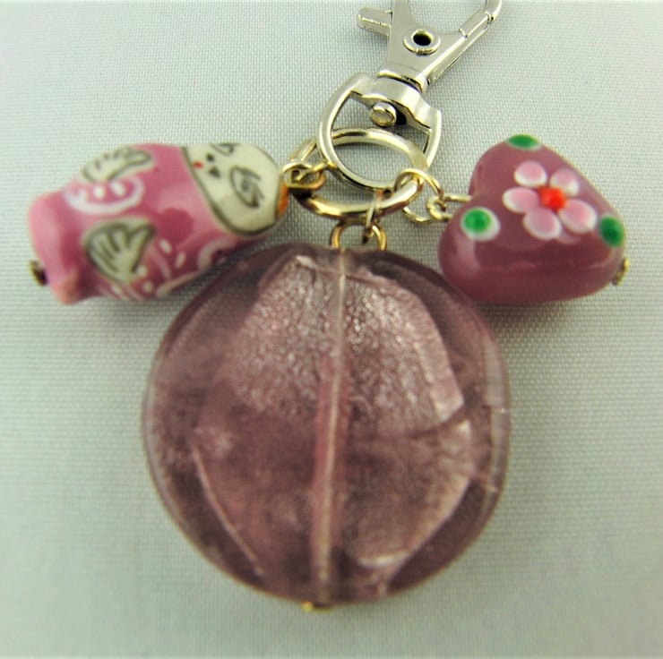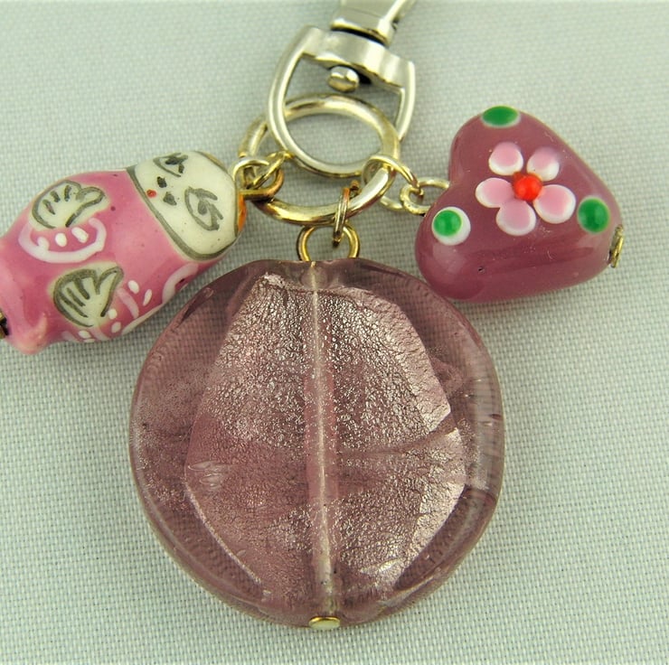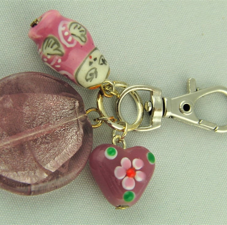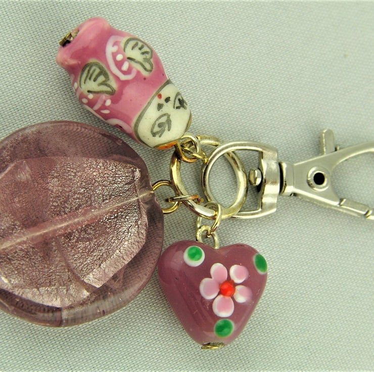 Pink Ceramic Russian Doll, Pink Glass Heart Bead and Glass Coin Bead Bag Charm