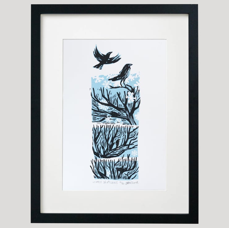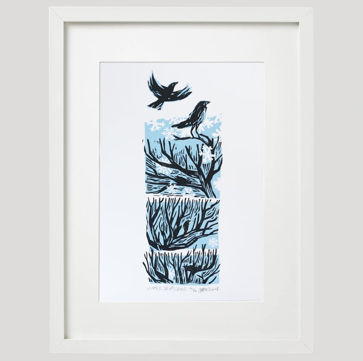 This "Crows" linocut print is from a limited edition of 50. Each one is named, signed and numbered by me. It is part of the "Winter Drifts" range.