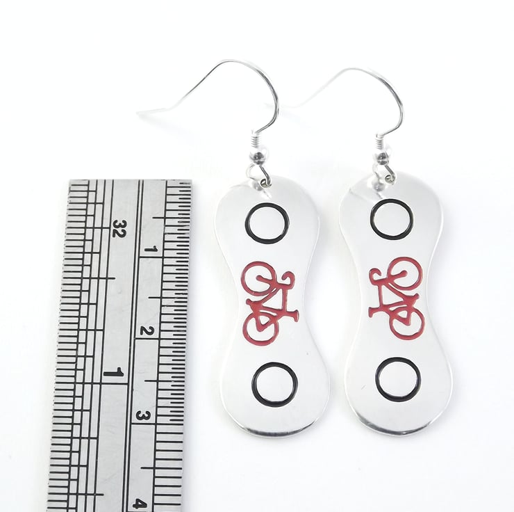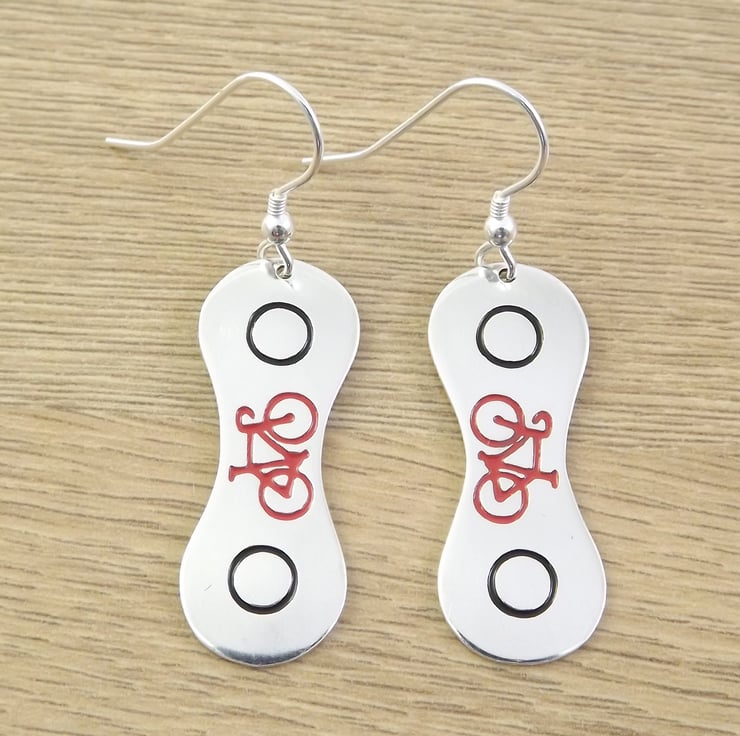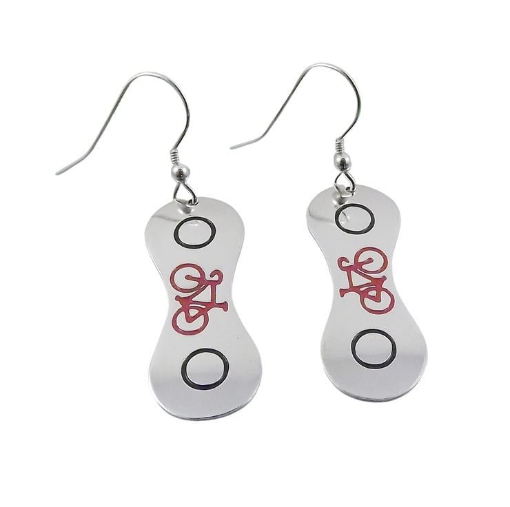 These bicycle chain drop earrings were inspired by the links of a bike chain and have been lovingly crafted by hand. They are made from recycled sterling silver which is etched before being cut out by hand, the edges are then smoothed using files and emery paper. They are shaped using a punch and hammer. Black and a coloured resin based enamel are added to the etched areas before being polished. The earrings are then attached to ear wires.