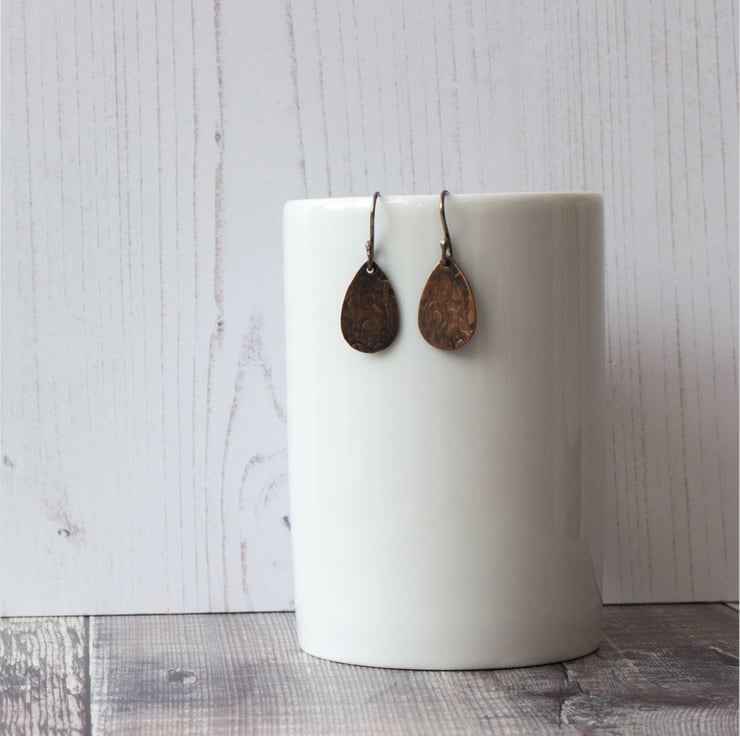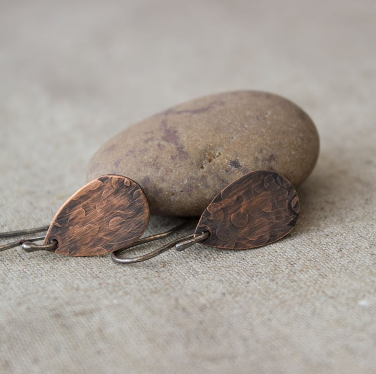 These copper abstract floral pattern earrings are textured using one of my favourite hammers! I've oxidised them for a lovely rustic finish and then given them a coat of Renaissance Wax to preserve the finish.