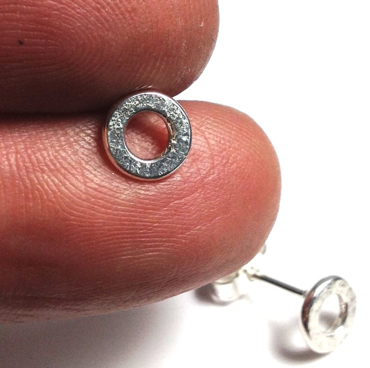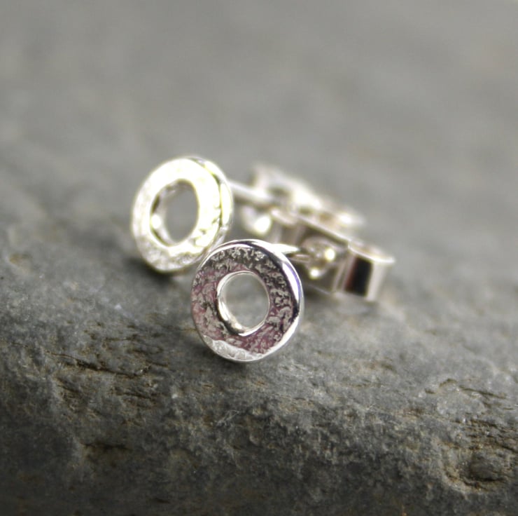 These little ring studs have a flattened hammered texture. They have been burnished to a subtle shine.