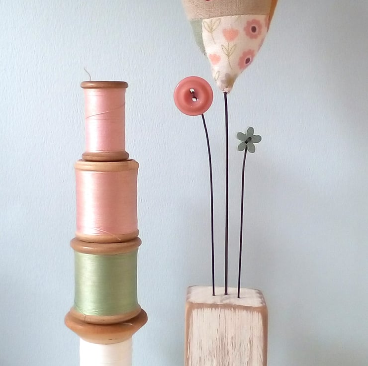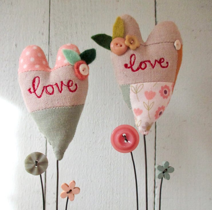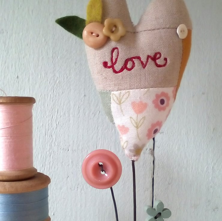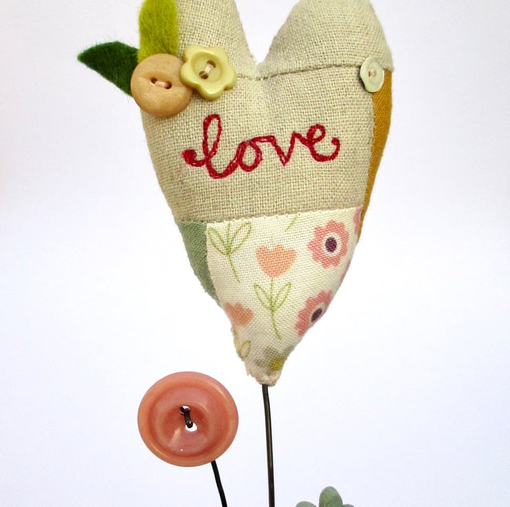 I love using remnants of fabric and felt to create these love tokens. The wording is created by freehand embroidery on my sewing machine and buttons from my collection become little dancing flowers to complete the scene.
