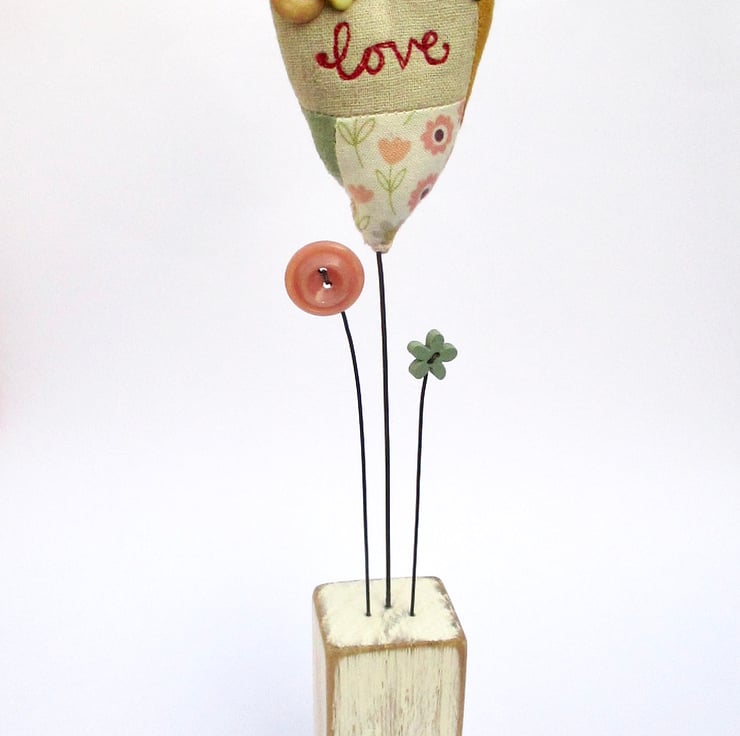 A delicate hand crafted individual token of love, this fabric heart stands on a painted wooden block.