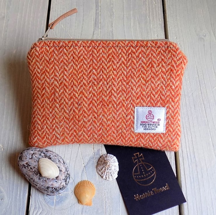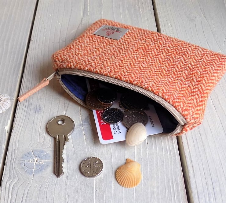 Harris Tweed large coin purse/ small make-up bag/ gadget pouch. Beautiful herrinbone weave in orange and beige. It is lined with mid blue cotton fabric, with a beige zip and natural leather zip pull. It has an internal divider pocket to the full width of the purse, which will easily fit your bank cards, coins/notes. The purse is also suitable as a small make-up bag, a large keys pouch, or a multitude of other uses for keeping things organised in your bag or pocket.