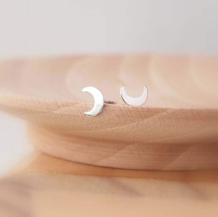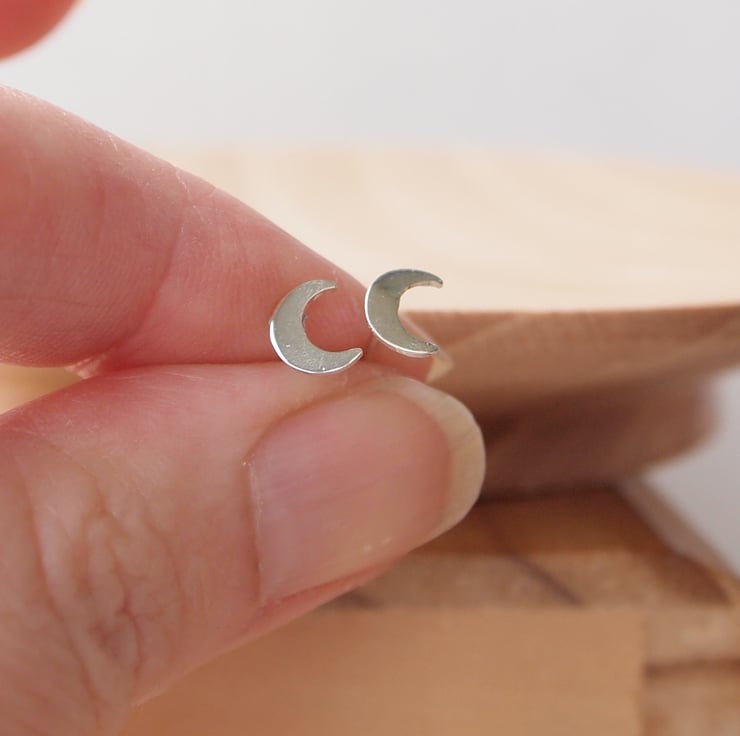 Sterling silver tiny stud earrings in a moon shape design. Made from Sterling Silver the earring features a crescent moon measuring approx 11mm at it's widest point.