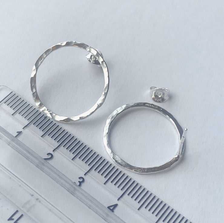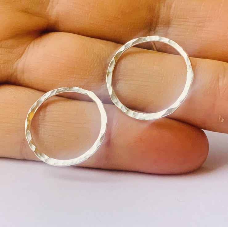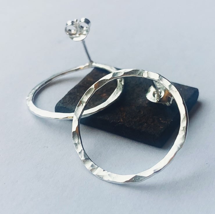 Hoop stud earrings approx 20 mm diameter hammered sterling silver,. The hoops are made with 1.2 mm sterling silver wire with a hammered dimple texture. Not too small and not too heavy, the dimple texture will catch the light and catch the eye.