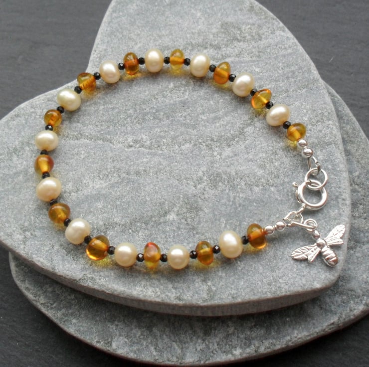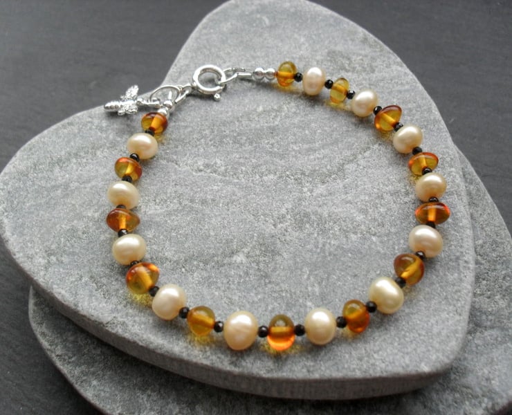 Genuine Baltic amber,small black spinel and champagne freshwater pearl bracelet with sterling silver . Bracelet has a sterling silver bee charm.