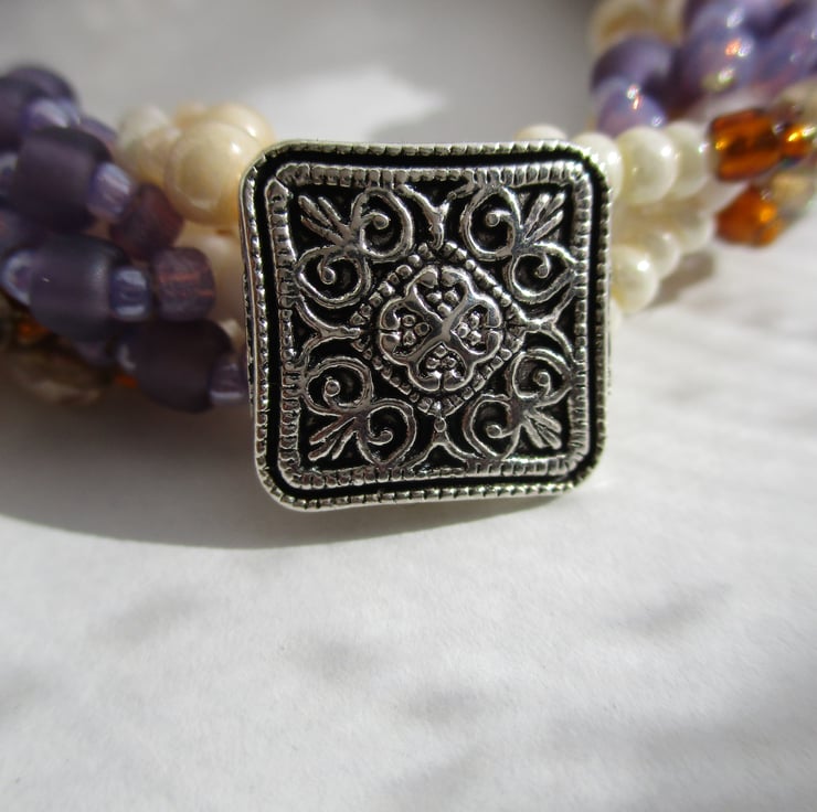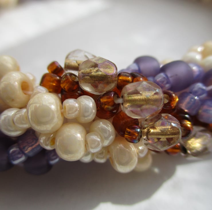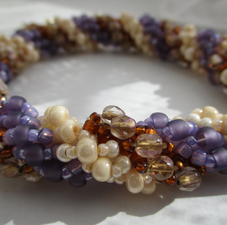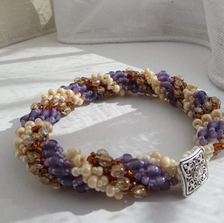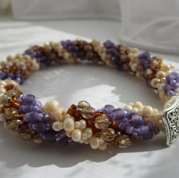 Very pretty bracelet made with size 6,8 and 11 seed beads and fire polished beads, the bracelet spirals in shades of lavender, cream and bronze each spiral has an accent bead in a different size and shape which gives the bracelet texture and interest, the accent bead in the bronze spiral are fire polished beads and give a lovely sparkle, the bracelet is finished off with a pretty silver colour button, which makes the bracelet easy to fasten.
