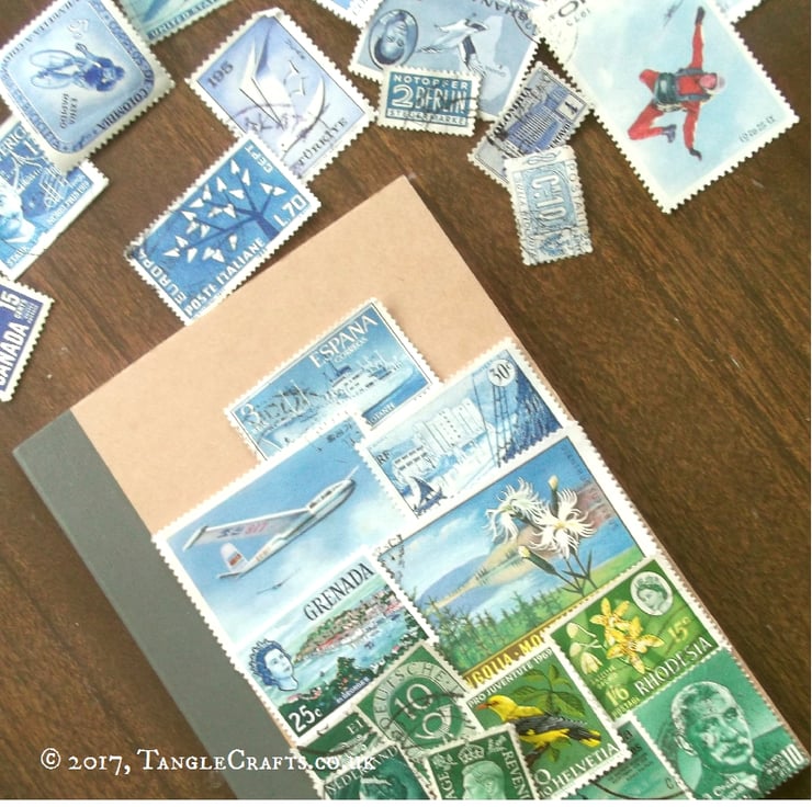The front cover is entirely covered with used postage stamps (using an acid-free, xylene-free adhesive), then coated with matt sealant for extra durability. The inner front cover is signed & dated.