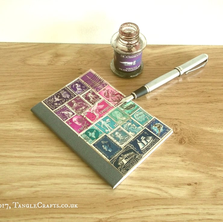 The front cover is entirely covered with used postage stamps (using acid-free, xylene-free adhesive), then coated with a matt sealant for extra durability. The inner front cover is signed & dated.