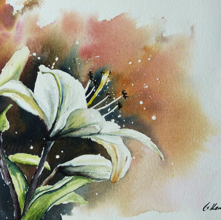 My paintings are inspired by places, memories and feelings. Sometimes I start with a sky and see where it leads me. This particular painting was unplanned, I sat down to paint and noticed a vase of flowers on the table, the Lily caught my eye and I had to paint it.