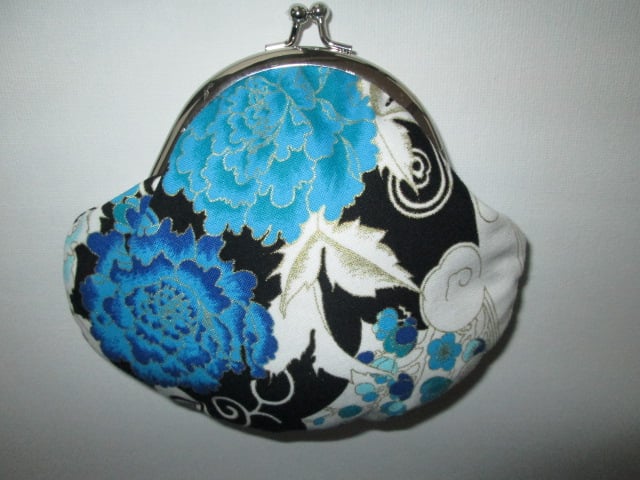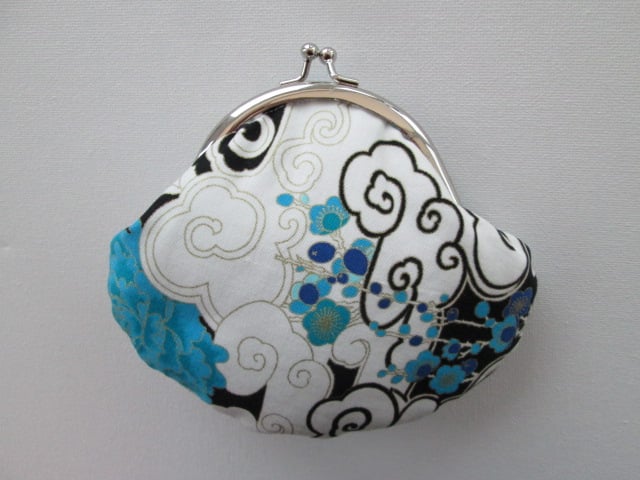 Perfect little purse for your keys, change and credit cards or mobile phone.Pretty turquoise and white fabric with contrasting lining, padding and metal frame clasp.